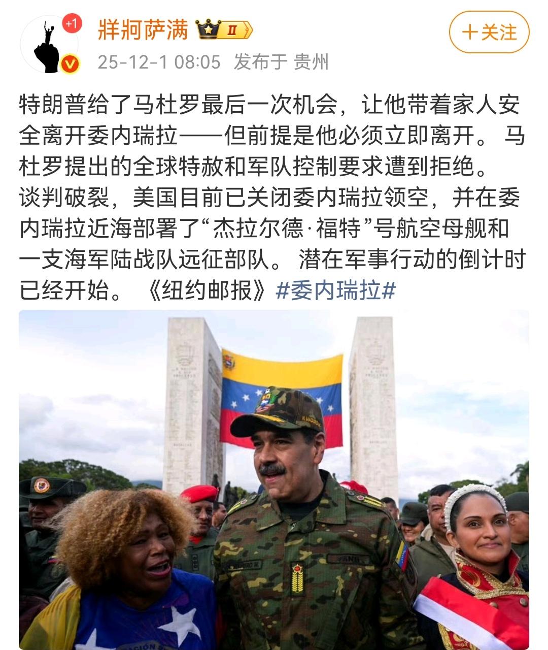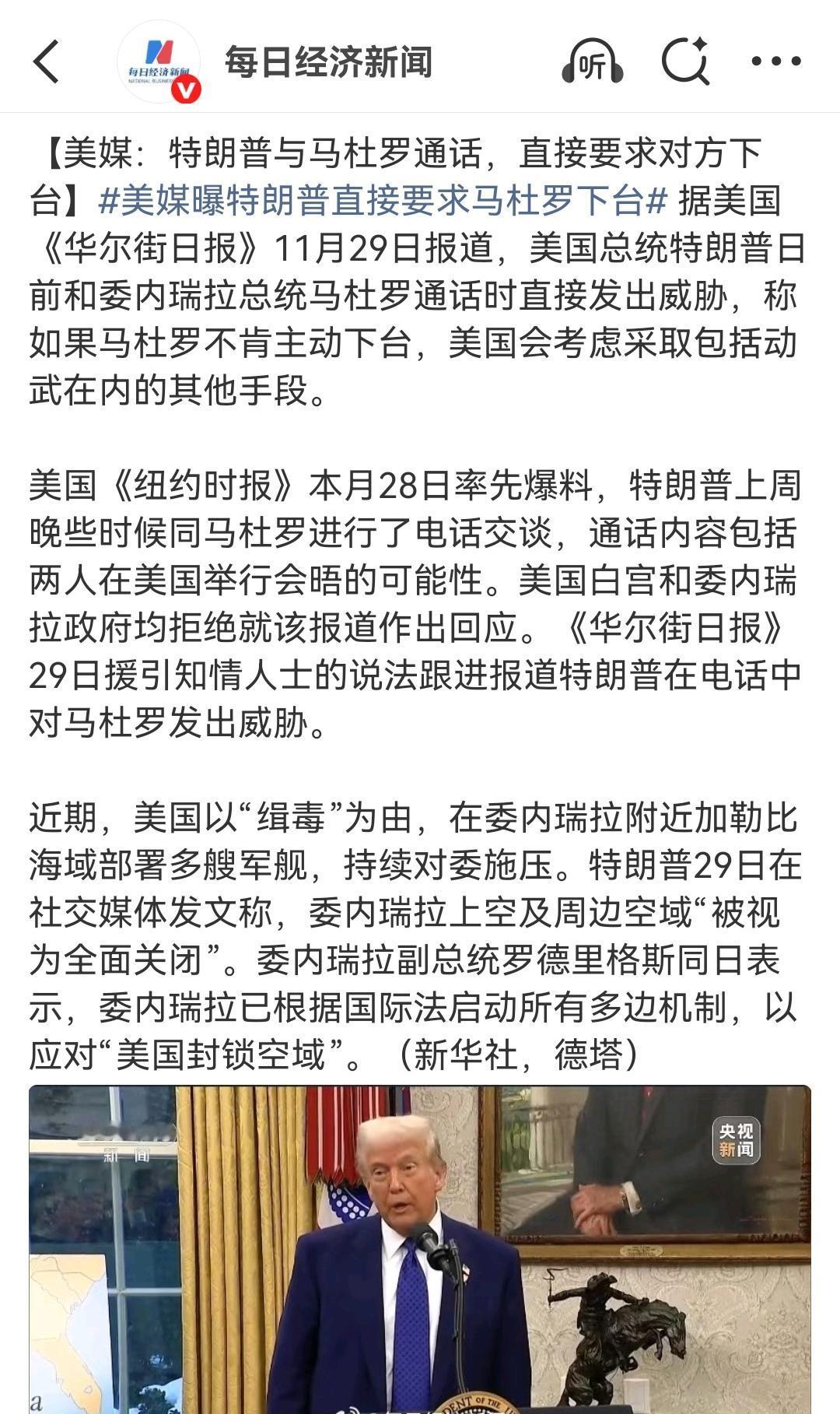 美国总统特朗普极限施压委内瑞拉。 (如图所示)美国总统特朗普特别喜欢玩极限施压,这可能是当商人时养成的习惯。如今美国以“缉毒”的名义对委内瑞拉进行海空封锁,随时准备动武。球就在委内瑞拉总统马杜罗这边了,看他是否扛得住这巨大的压力。