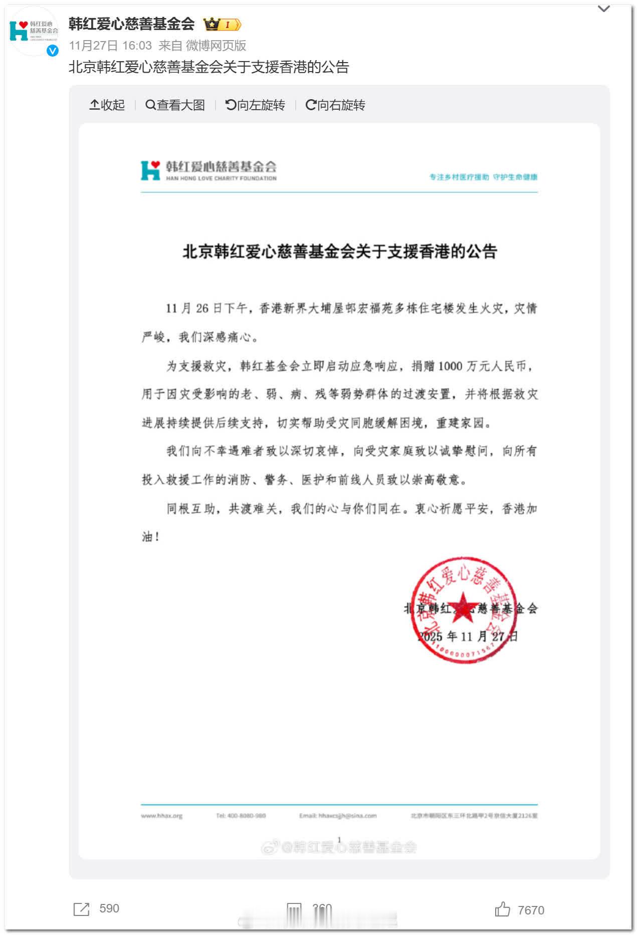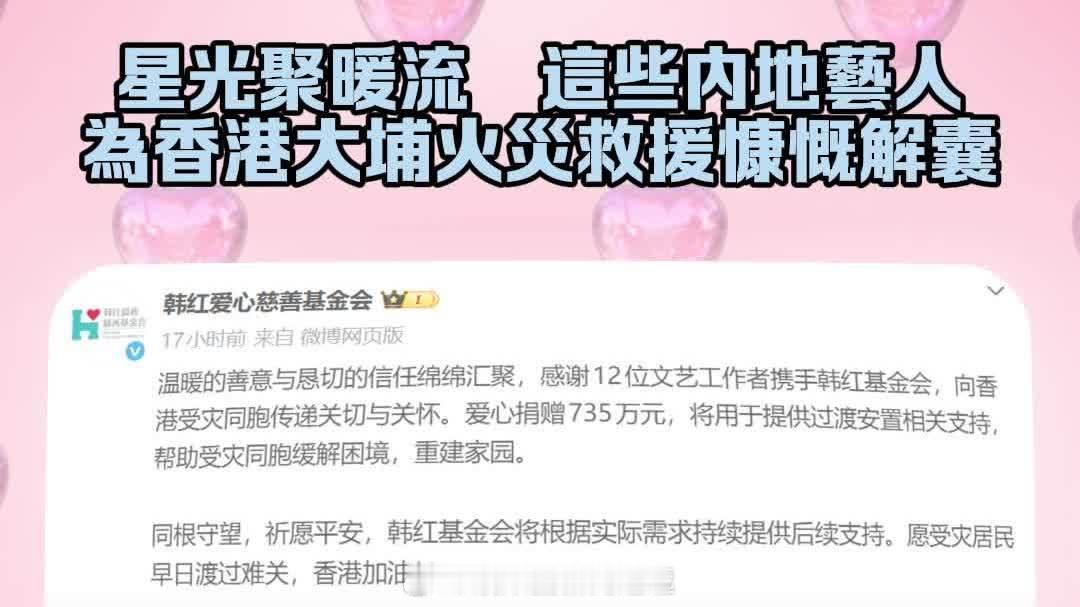 「大埔宏福苑五级火警 (有視頻)星光聚暖流…多位内地 藝人為香港慷慨解囊 … 大公文匯網報道,大埔宏福苑五級火災牽動無數人的心。香港演藝圈中,英皇集团 及旗下藝人合共捐款超過2,000萬港元;連同向华强 ()夫婦、朱李月华 女士透過「有緣慈善基金」捐款共300萬港元,及捐款200萬港元,、、夫婦、夫婦、、等各捐贈100萬港元;、捐款50萬港元,捐贈30萬港元,、各捐20萬港元。內地藝人踴躍捐獻,為受災居民提供支援,攜手走過困境,共同守望相助。災情發生後,韩红 (韩红爱心慈善基金( )率先挺身而出,緊急捐資1,000萬元人民幣助力救災。基金深夜發文「同根互助」,短短四字道出億萬同胞的深切牽掛..」入內看視頻及全文:网页链接 即时娱乐新闻 娱乐圈 乐坛 电视 电影 .………. 香港
