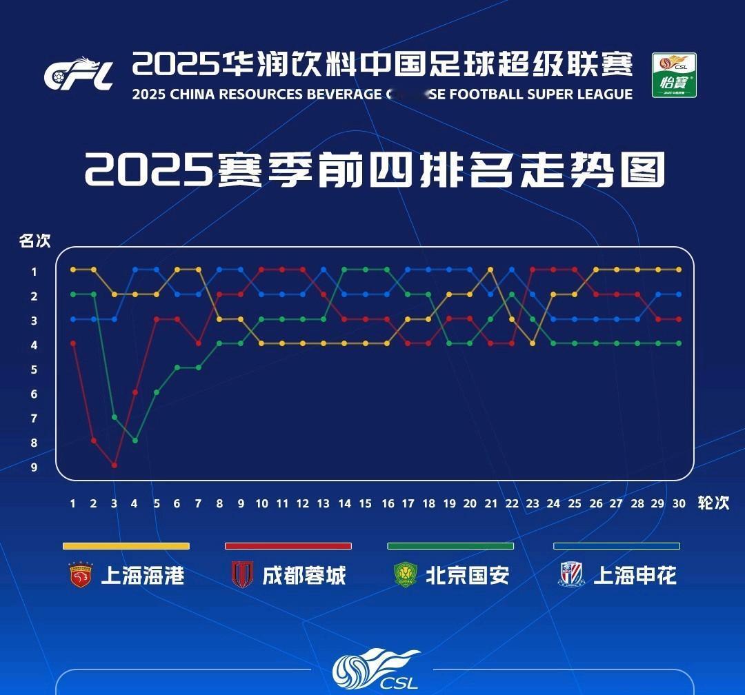 争夺最激烈的一年?中超官方发2025赛季前四排名走势图,榜首共12次易主! 从中超官方这个走势图来看,上海海港10轮榜首,上海申花也是10轮榜首,成都蓉城6轮榜首,然后北京国安3轮,还有一轮应该是山东泰山。 这样看最稳定的应该是上海申花,没有掉出前三名。另外就是北京国安,这样看拿不到冠军也正常,只有三轮榜首,领先优势也不大,因为正好在14、15、16轮,所以拿了个半程冠军。 本赛季榜首领先优势最大的时候,应该是上海申花,当时领先6分,所有人都说申花冠军稳了!