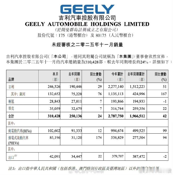 吉利汽车11月销量310428辆 银河系列,同比去年大涨76%。极氪系列,同比去年大涨7%……领克系列,同比去年大涨7%……