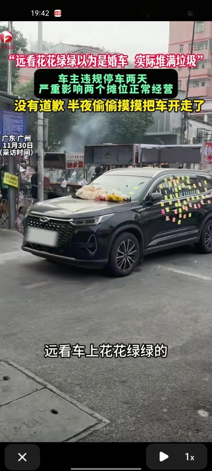 11月27日,广东广州。网友晒视频表示,车上花花绿绿,以为是婚车,走进才看到车上有垃圾,车身贴满违规停车的纸条。这里本来是卖福鼎肉片和麻辣烫的两个摊位,也是这段街市最火的摊子,违规停车严重影响到这两个摊位的正常经营。直到第二天晚上九点,车主才骂骂咧咧地现身,半夜偷偷摸摸把车开走了。