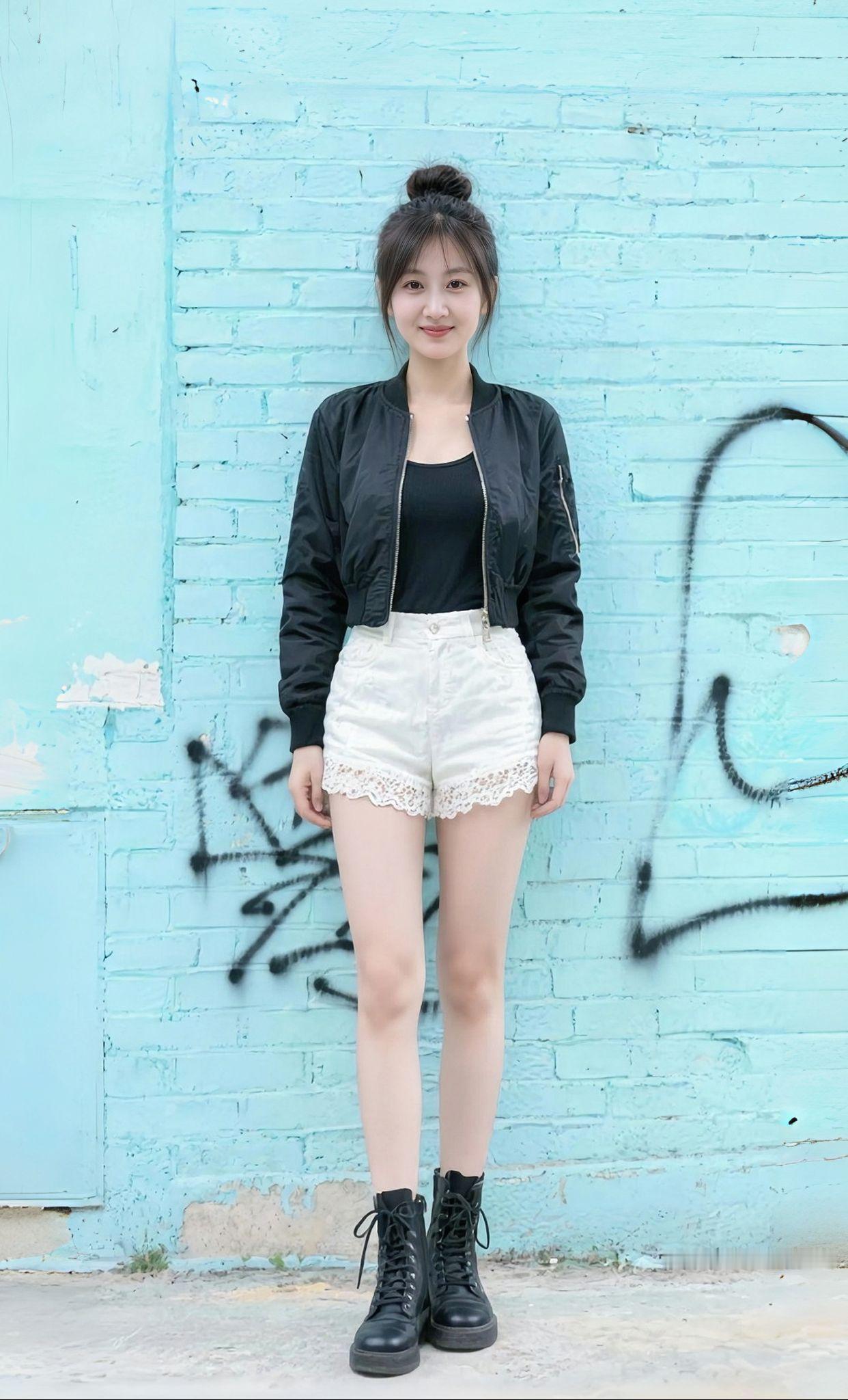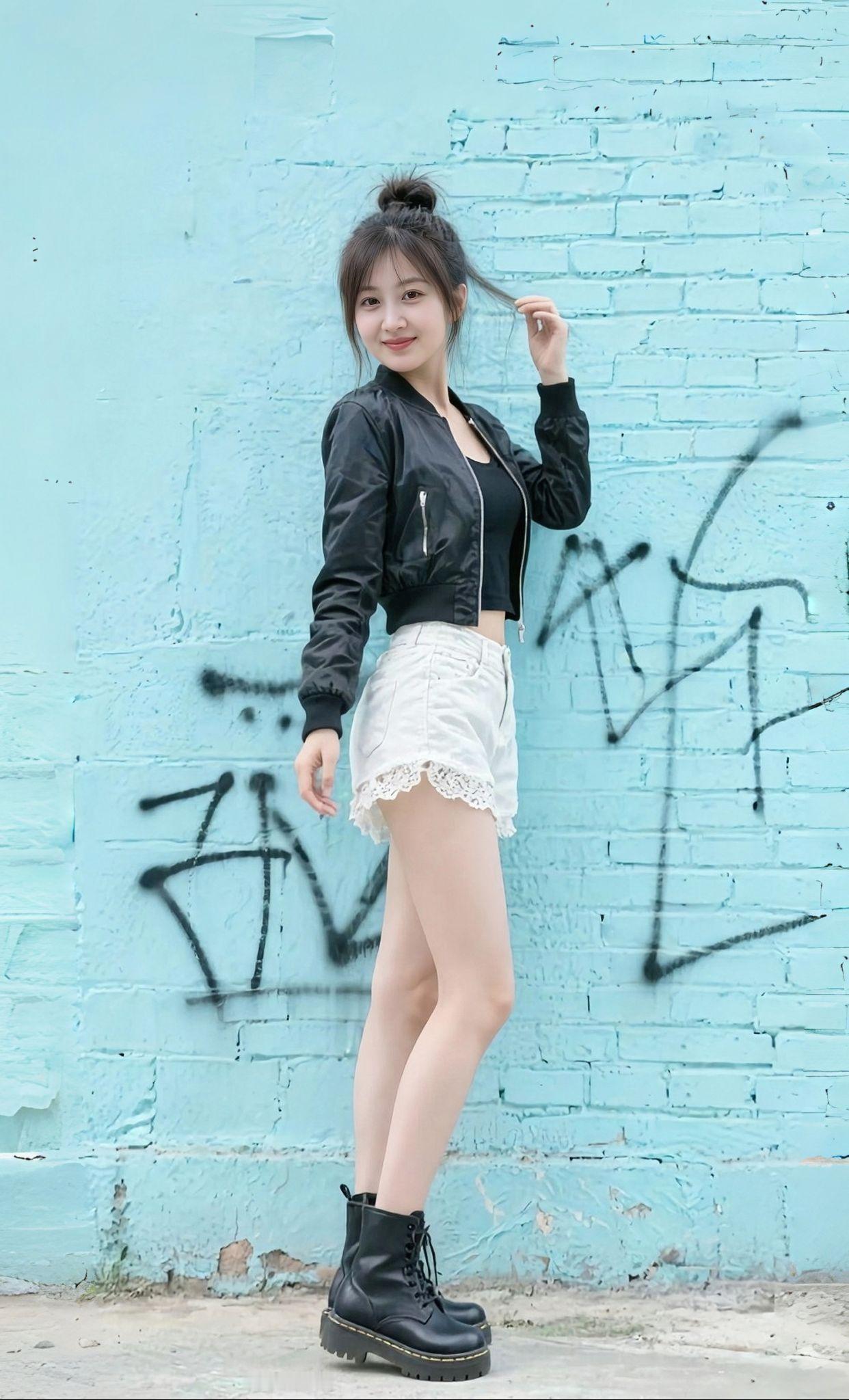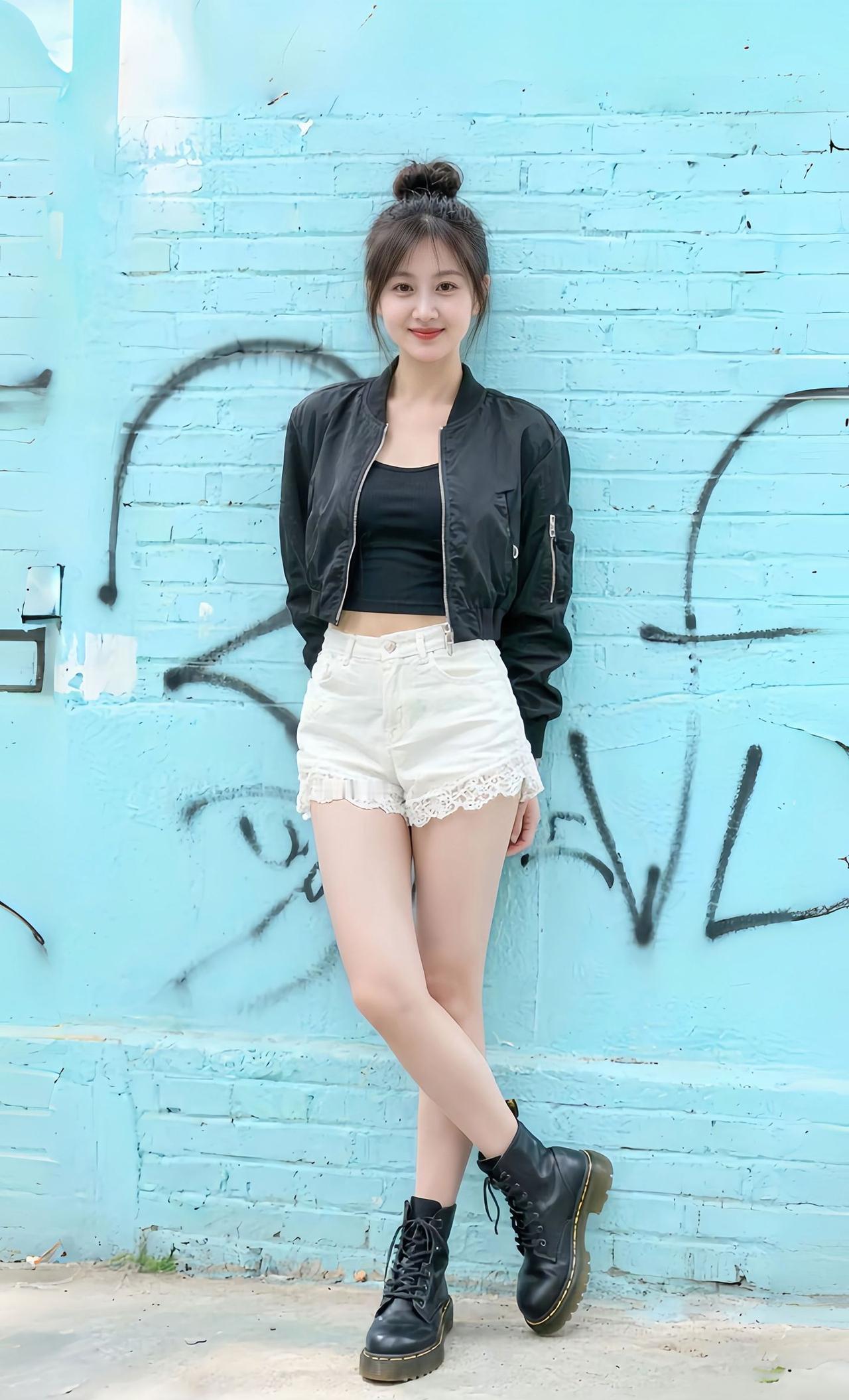 街头巷尾的涂鸦墙,诉说着城市的秘密。 身穿黑丝皮外套,搭配白色短裤和黑色马丁靴,每一步都是青春的印记。