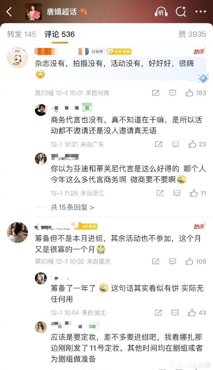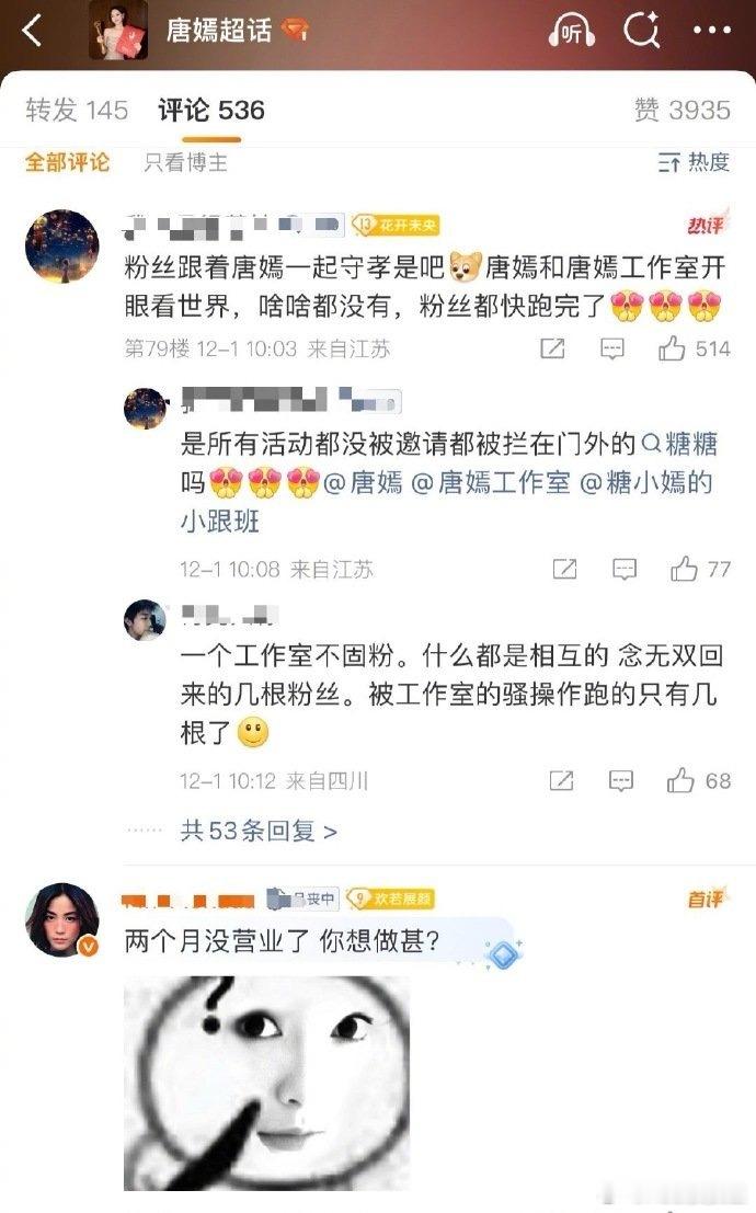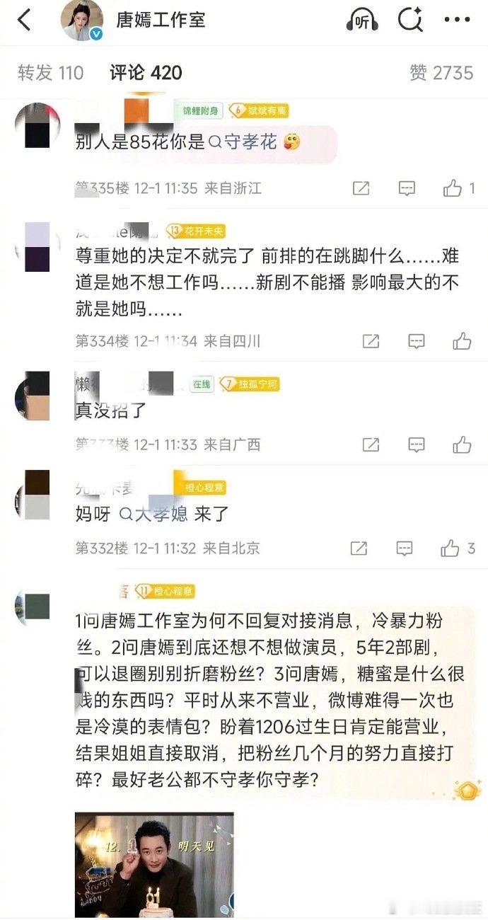 花粉的事业心太强了,比如唐嫣粉丝。唐嫣因为12月的生日要低调从简,以及没有任何行程安排,引发了粉丝的集体不满。如今,唐嫣工作室评论区,甚至找不到几条好评,基本都在吐槽唐嫣没有事业心,用词特别犀利……