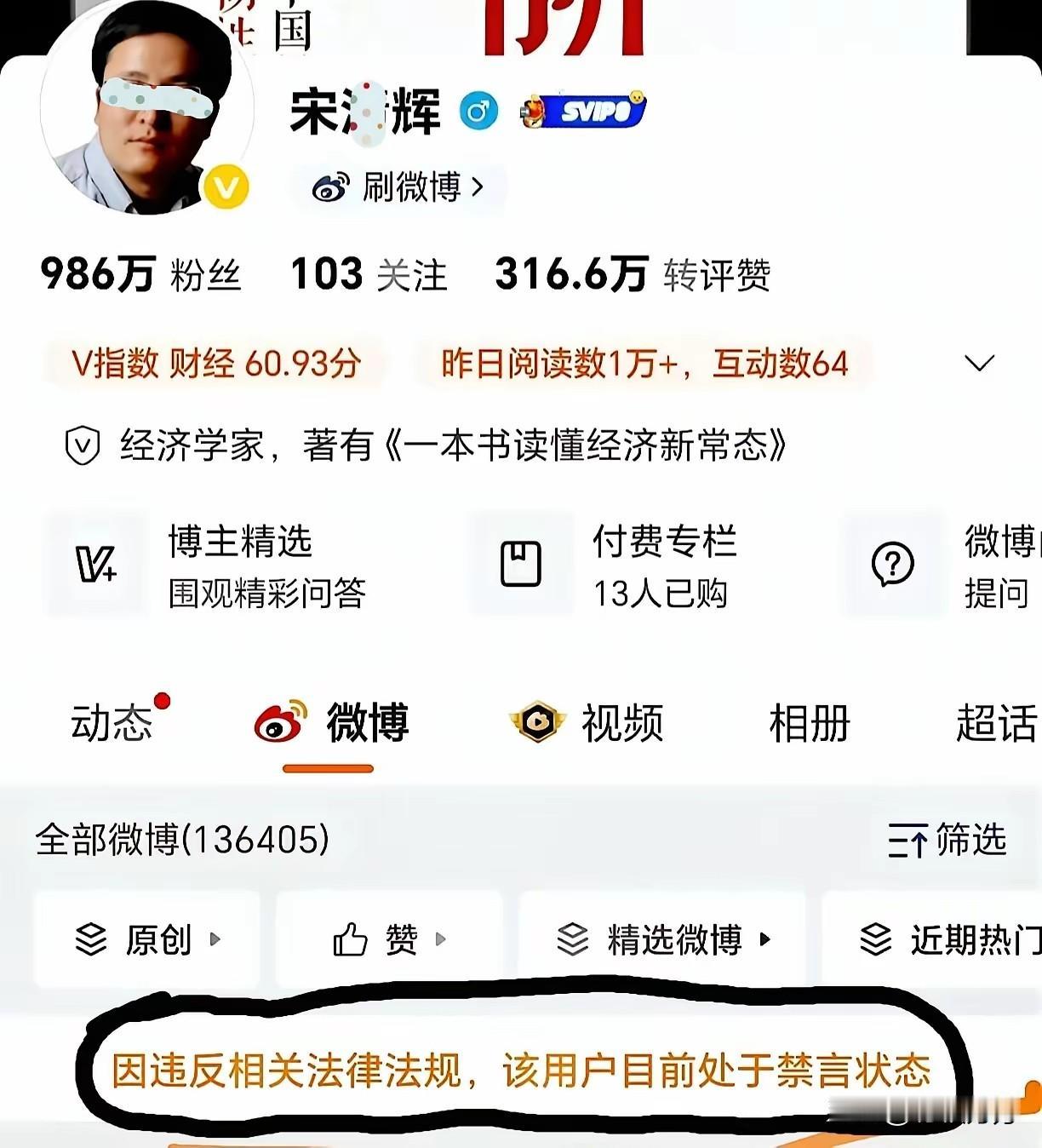 据说网红经济学家宋清辉的微博帐号被禁言了,前两天还有人在说另一个大V九边也被限制,名声越大所受的关注越多,出错的概率越大,被罚也可以理解。[笑哭] 说起这个宋清辉,虽然号称经济学家,但也没什么经济理论方面的研究与建树,常在网络上作些惊人之论,却通常没有合格的论证,所以常被人质疑其经济学家的成色。 但是,话说回来,一个自媒体作者的作品质量是一回事,违不违规又是另一回事。平台既然判定作者违规,相信一定有其理由,那就该大大方方把理由列出来,也算是明正典刑,让违规者明明白白受罚。象这样只说是“违反相关法规”,就有些“莫须有”的傲慢,有“葫芦案”的嫌疑。