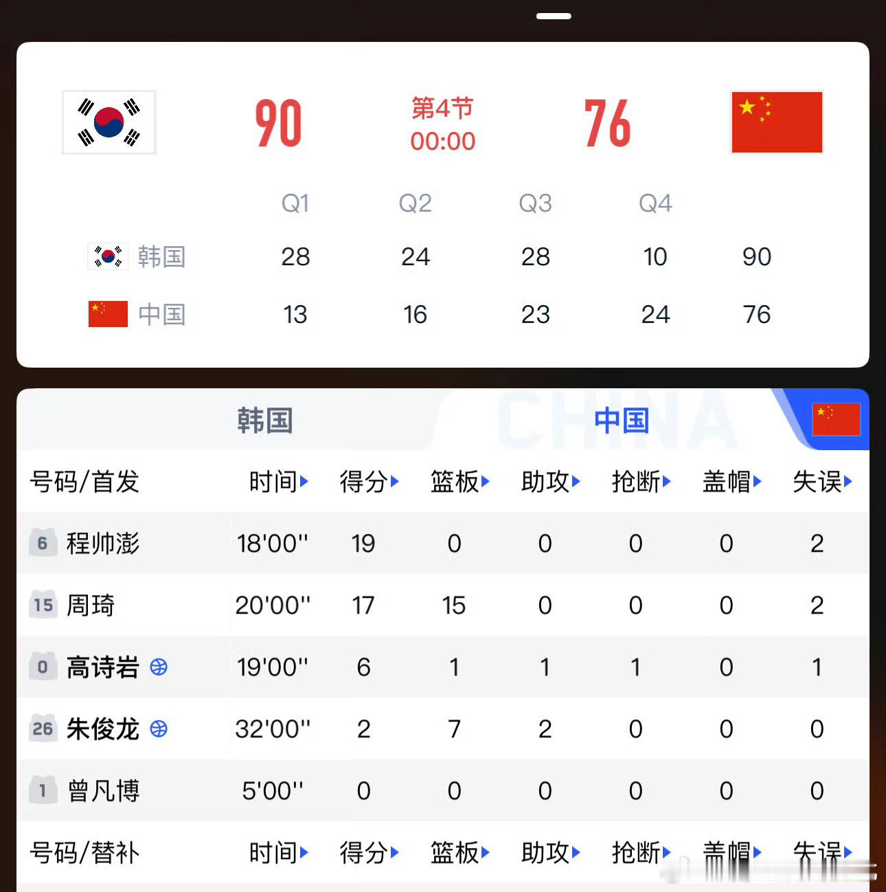 中国男篮vs韩国男篮 第一节只得到13分,落后韩国队15分,这是只少了一个赵睿的