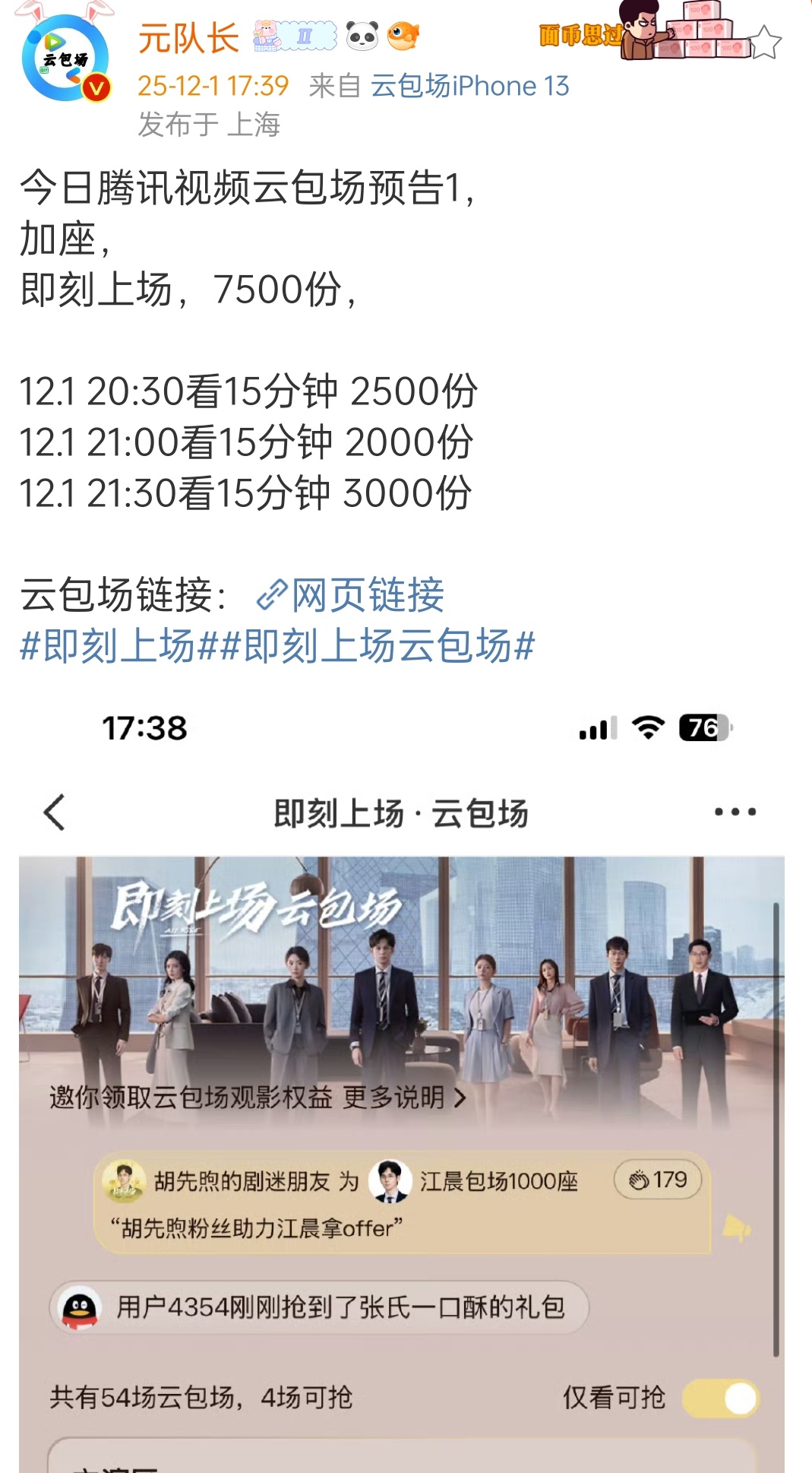刘宇宁又又双叒叕包场了摩登兄弟这次是腾讯新剧《即刻上场》的编剧张巍老师,刘宇宁真