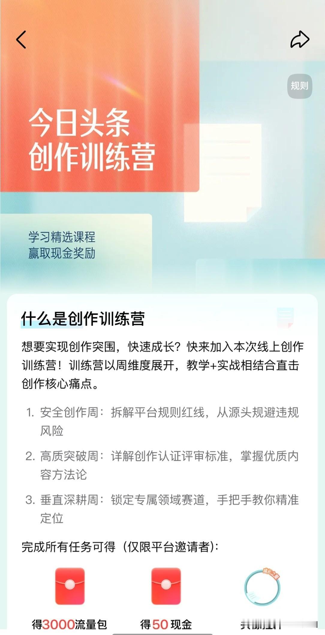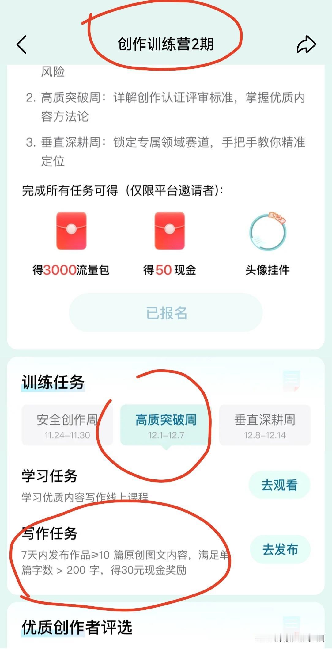 今日头条“创作训练营2期”活动第二周——高质突破周(12.1-12.7)开启啦! 在本周内(12月1~7日)需完成以下两个任务,即可获得奖励——现金¥30元! 一、学习任务:观看学习优质内容写作线上课程; 二、写作任务:7天内发布作品≥10篇原创图文内容,满足单篇字数>200字,得30元现金奖励。 是不是非常简单?应该都能完成吧! 参加“创作训练营1期”活动时,由于没有仔细阅读规则,同时还参加了其它活动,写着写着便中断了,属于半途而废!后来看到参加活动的小伙伴们纷纷都在晒奖金,才恍然大悟!原来是自己错过了!捶胸顿足地懊恼了半天,最后决定奋发图强,把错过了通通拿回来! 果然!人还是要专一点比较好!参加太多活动有点三心两意的嫌疑,貌似有点渣了! 这一次,我决定痛改前非,一心一意只参加一个活动,那就是今日头条“创作训练营2期”活动! 参加活动的小伙伴们!卷起来吧! [强][笑哭][我想静静][作揖][比心][赞][我想静静][强]