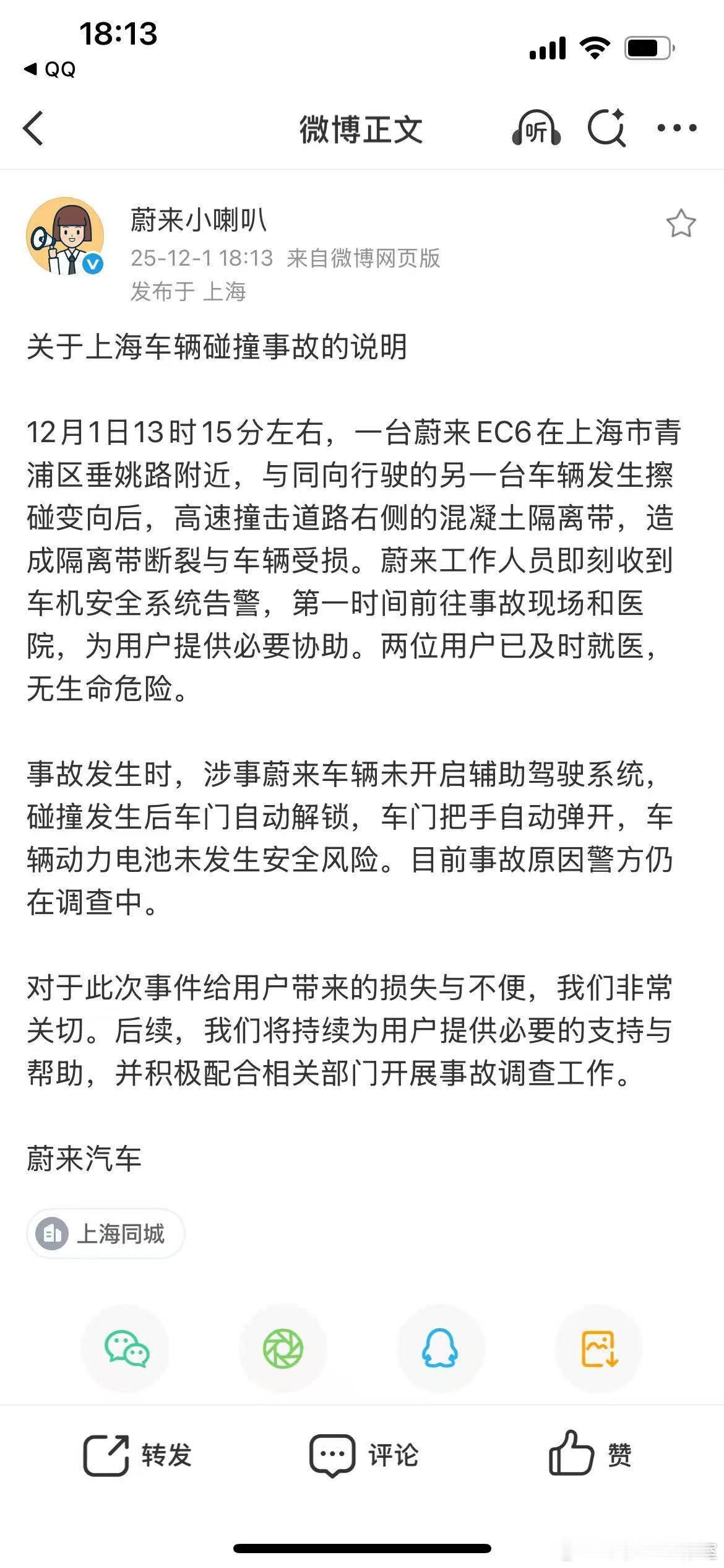 今天下午,上海青浦区一蔚来EC6发生事故。撞成这样人还活着,看图好像也没啥事,奇迹!目前,蔚来已通过微博官号进行公开回应。