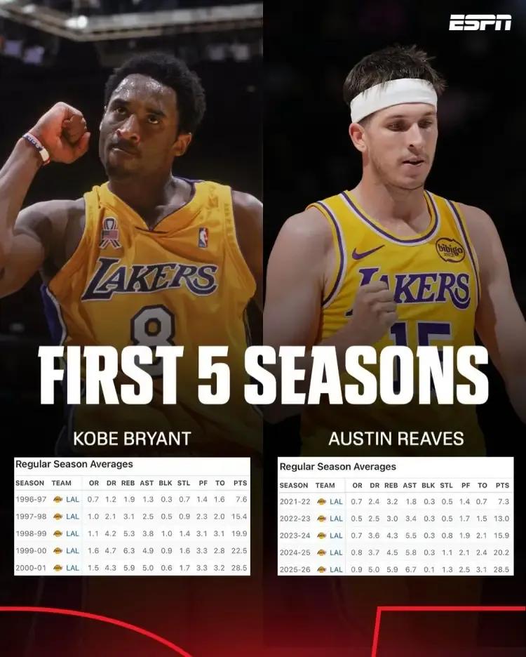 下一个科比?里弗斯和科比生涯首个赛季都是场均7分,生涯第5季,科比场均28.5分,而今年也是里弗斯的第五年,目前场均得分也是28.5分,这么一看俩人成长轨迹是一样一样的,不过里弗斯还是不可能成为科比,因为科比在湖人是绝对的老大,而今天的湖人里弗斯只能做老二!