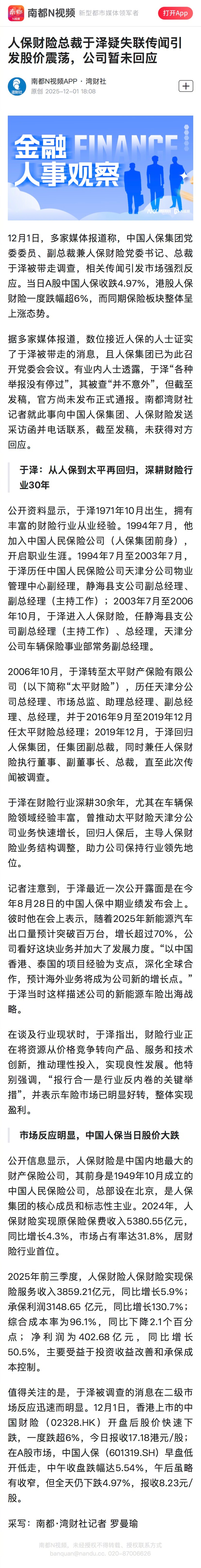 #人保财险总裁疑失联股价大跌#【人保财险总裁于泽疑失联传闻引发股价震荡,公司暂未回应】#人保集团暂未回应总裁失联传闻#12月1日,多家媒体报道称,中国人保集团党委委员、副总裁兼人保财险党委书记、总裁于泽被带走调查,相关传闻引发市场强烈反应。当日A股中国人保收跌4.97%,港股人保财险一度跌幅超6%,而同期保险板块整体呈上涨态势。据多家媒体报道,数位接近人保的人士证实了于泽被带走的消息,且人保集团已为此召开党委会会议。有业内人士透露,于泽“各种举报没有停过”,其被查“并不意外”,但截至发稿,官方尚未发布正式通报。南都湾财社记者就此事向中国人保集团、人保财险发送采访函并电话联系,截至发稿,未获得对方回应。 南都·湾财社记者 罗曼瑜