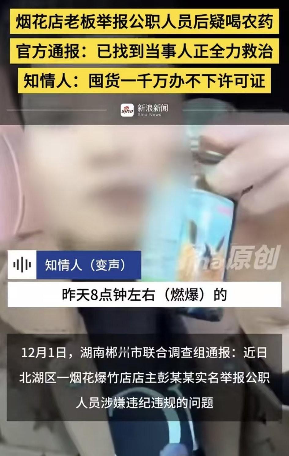 郴州烟花店老板86年的,还不到40岁,喝了两瓶除草剂,很难救活啊! 即便马上洗胃,残留农药也能腐蚀内脏。 看过一个纪录片,一个年轻小伙喝了百草枯,急救后有几天人看着挺好的,能吃能睡,但医生说命保不住了,让家人准备后事。 果然让医生说中了,很快病情急转直下,人说没就没了。 用这种方法泄愤对自己太残忍,这个彭老板太极端了,什么能有命重要呢?! 据说他当时没在宝马车上,而是在另外一辆车里喝的除草剂。 自己受罪不说,店也没了,货也没了,车也没了,破釜沉舟,完全都不顾及家人感受。 即便那些吃拿卡要的行为被调查坐实,又有什么用!