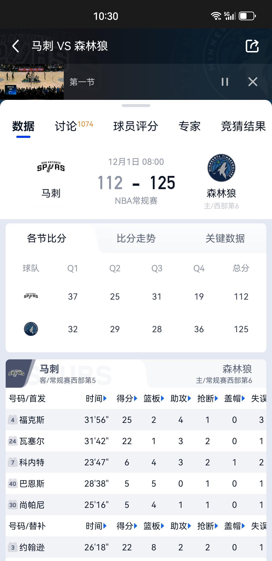 看了今天马刺客场挑战森林狼 前三节领先的情况下 第四节一上来就被一波流带走 福克斯瓦塞尔之流软得像面条 凯尔登没有战术地位只能干着急 打硬仗还得文班亚马卡斯尔凯尔登 他们三才是马刺顶梁柱