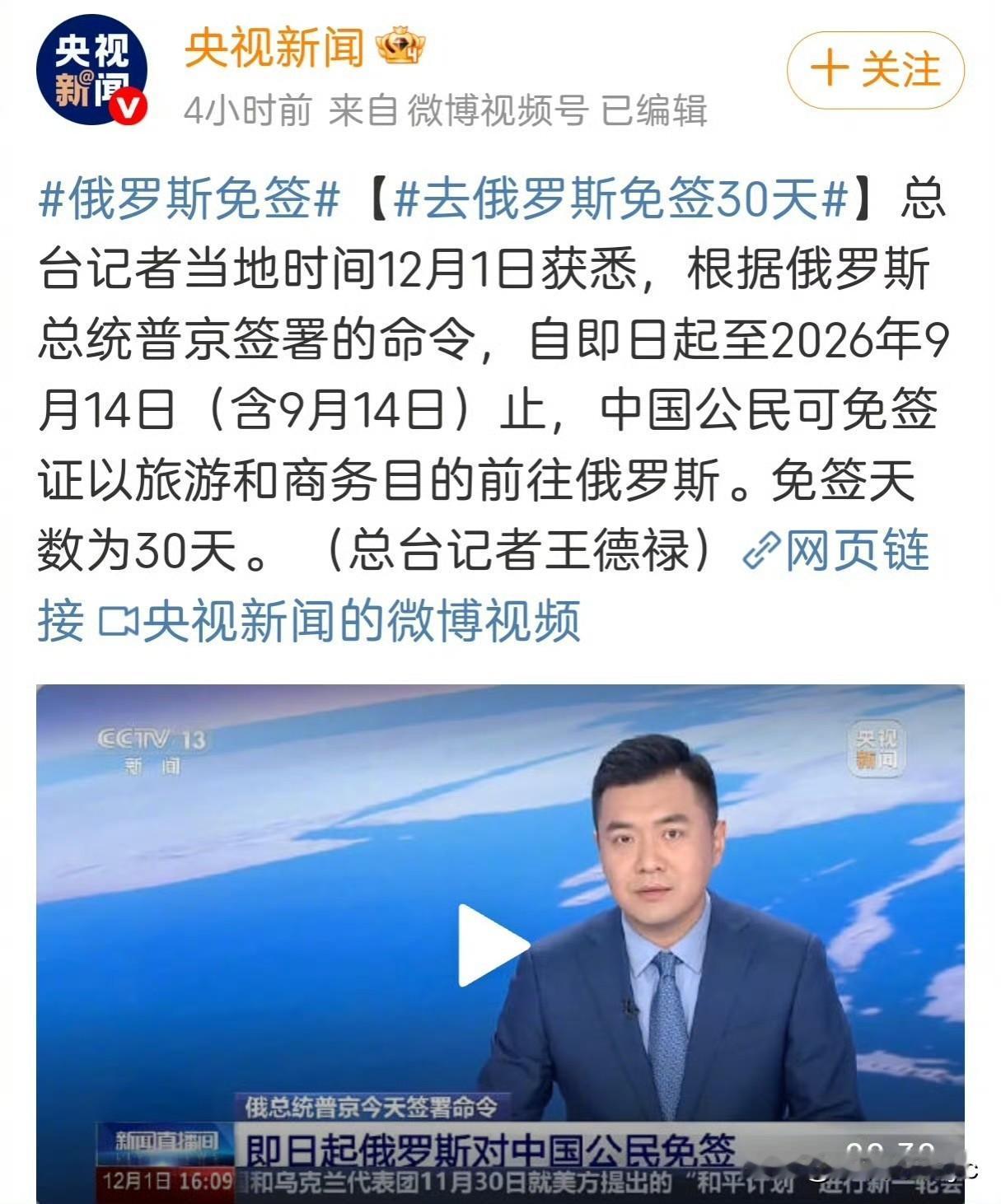 央视新闻报道,根据俄罗斯总统普京签署的命令,即日(12月1日)起至2026年9月14日(含9月14日)止,中国公民可以免签证前往俄罗斯旅游或从事商务活动。免签天数为30天。这项新政是中俄双向免签安排的重要一步,标志着两国人员往来进入新阶段。 新政核心内容: *适用对象:持普通护照的中国公民。 *有效期限:即时生效,至 2026年9月14日(含当日)。 *停留时间:每次入境最长可停留 30天。 *入境目的:主要涵盖旅游观光和商务活动。根据俄罗斯官方文件,也适用于参加科学、文化、社会政治、经济和体育活动,以及过境。 *重要原则:基于对等互惠原则实施。 *特别提醒:赴俄学习、工作和采访报道等目的的人员,不在此次免签范围内,仍需提前办理相应签证。 此项新政标志着“双向免签时代”开启:这不是一个单方面的政策。早在今年9月,中国外交部就已宣布,自2025年9月15日起,俄罗斯公民来华经商、旅游等也可享受30天免签。此次俄方政策的落地,意味着中俄两国间的双向免签安排正式对接完成,形成了一个近一年的政策窗口期。 政策明确是“临时”安排,设置了明确的截止日期(2026年9月14日)。其法律基础是“本着对等原则”,这是国际关系中常见的互惠做法,旨在促进特定时期内的人员交流。 政策主要服务于旅游和商务这两大高频、短期的出行需求,旨在便利人员往来、深化民间交流、促进经贸合作。同时,也明确排除了留学、工作等需要长期居留许可的情形,边界清晰。 对两国人员往来是重大利好,凭普通签证,可以在家两国间来一次说走就走的旅行。