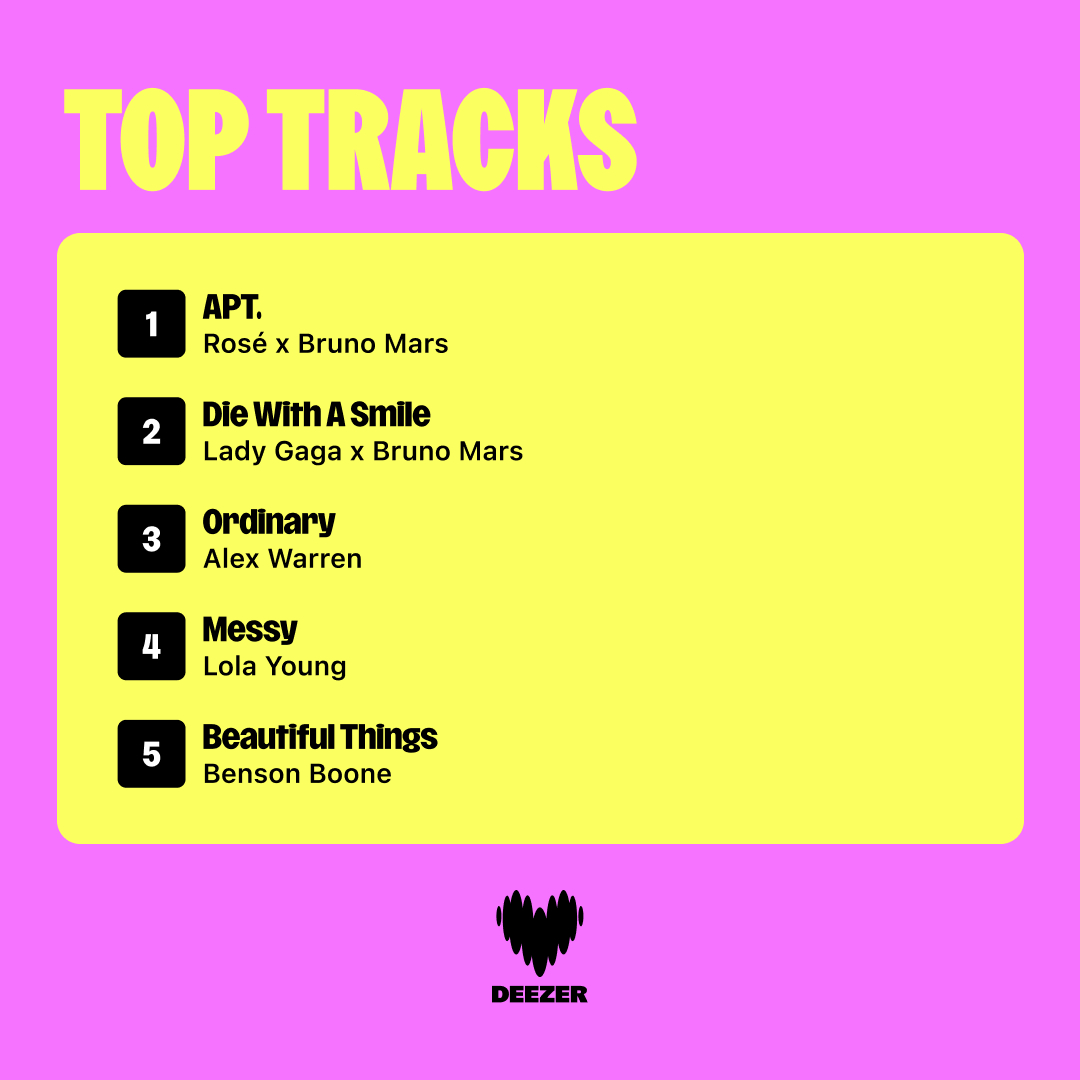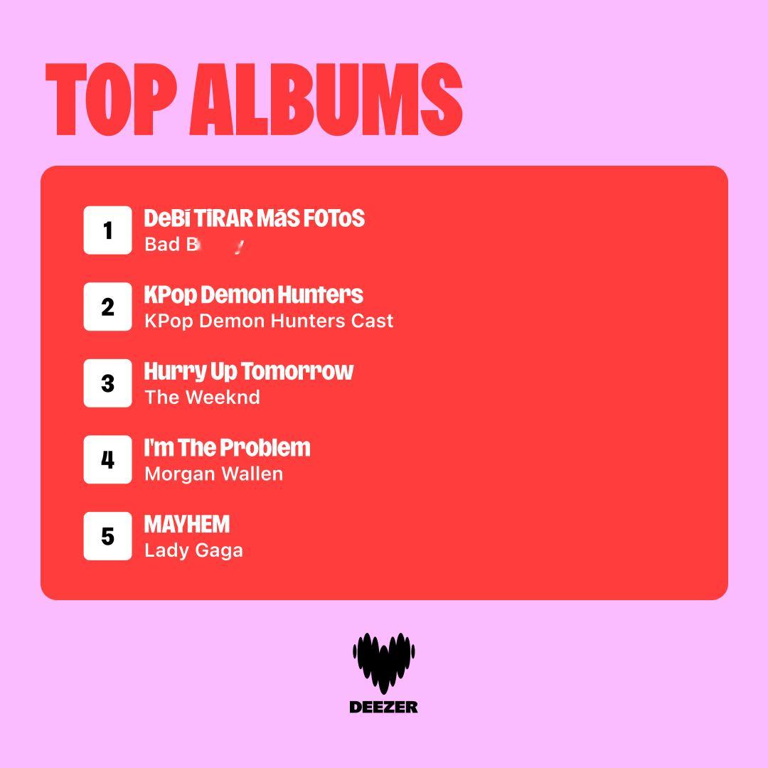 流媒体平台Deezer公布2025年播放量年榜!Lady Gaga成为年度歌手!坏兔兔Bad Bunny新专辑《DeBÍ TiRAR MáS FOToS》为年度专辑!ROSÉ朴彩英联手火星哥Bruno Mars爆单APT.成为年度歌曲!恭喜!