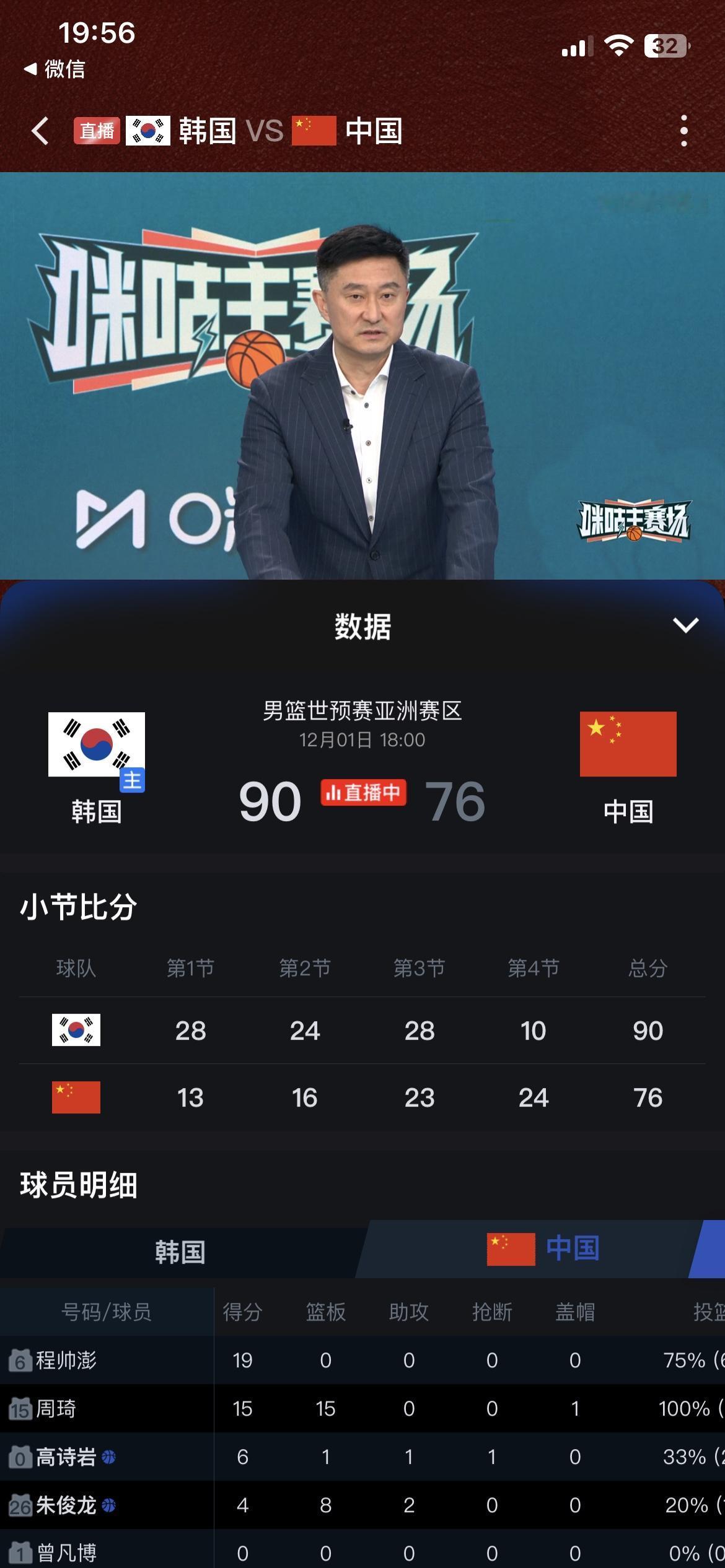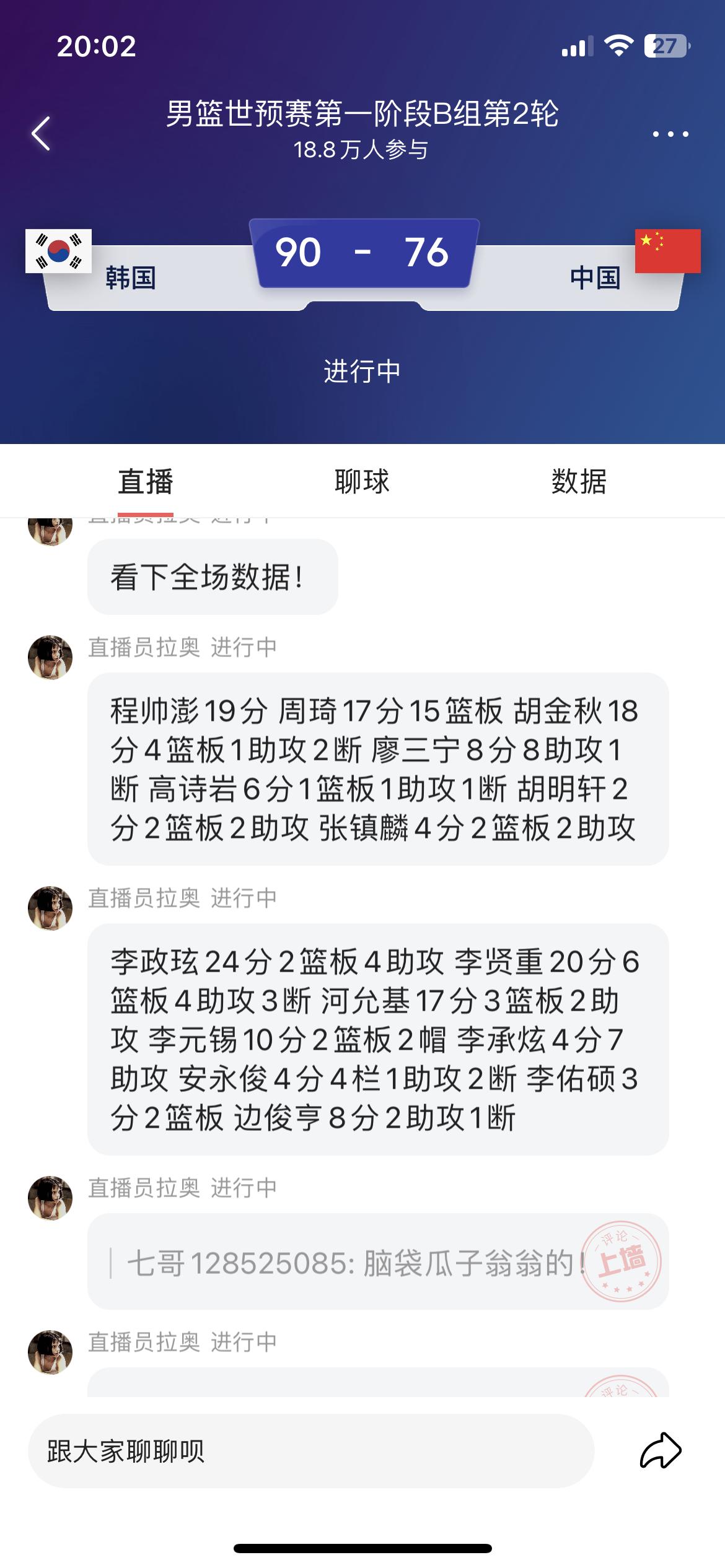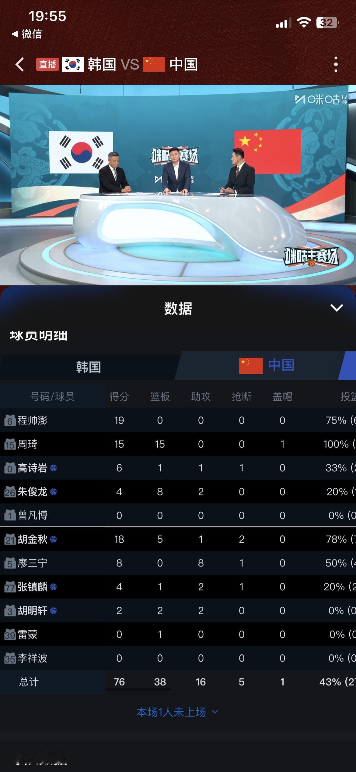 中国男篮整个队也就程帅澎够爷们,他是真想把球打好,不仅投篮坚决,还能投的进,关键是还能向队友喊一喊,让大家好好防守,其他队员一个一个都像丢了魂一样,蔫了吧唧的,不急不慢,防守时也是象征性的伸一下手,不管韩国队怎么得分,也不着急,也不生气,也不犯规,好像这球输赢和自己无关一样,没有荣誉感,没有进取心,每个人都输麻木了! 整个后卫线,除了程帅澎没有一个打得好的,王岚清干脆就不让他上场,这不就浪费一个名额嘛。四大锋线也没一个能打的,连防守也都防不住了,韩国队随便一个假动作就晃飞了,然后从容投篮进球。 内线周琦和胡金秋很少有舒服的投篮机会,后卫的球很难传到他们手里。整场比赛打得那个难看呀,最多竟然输30多分,脸都不要了,要不是韩国队控制时间没有下狠手,中国队能输40分。 这一场比赛失利,也不要怪主教练郭士强了,三分球连续11投,都投不中1个,你让波波维奇来了都没用,咱也不知道,这手感怎么这么差,按理说都是职业球员,投篮怎么会如此的差,后面还要打日本队,希望渺茫呀!