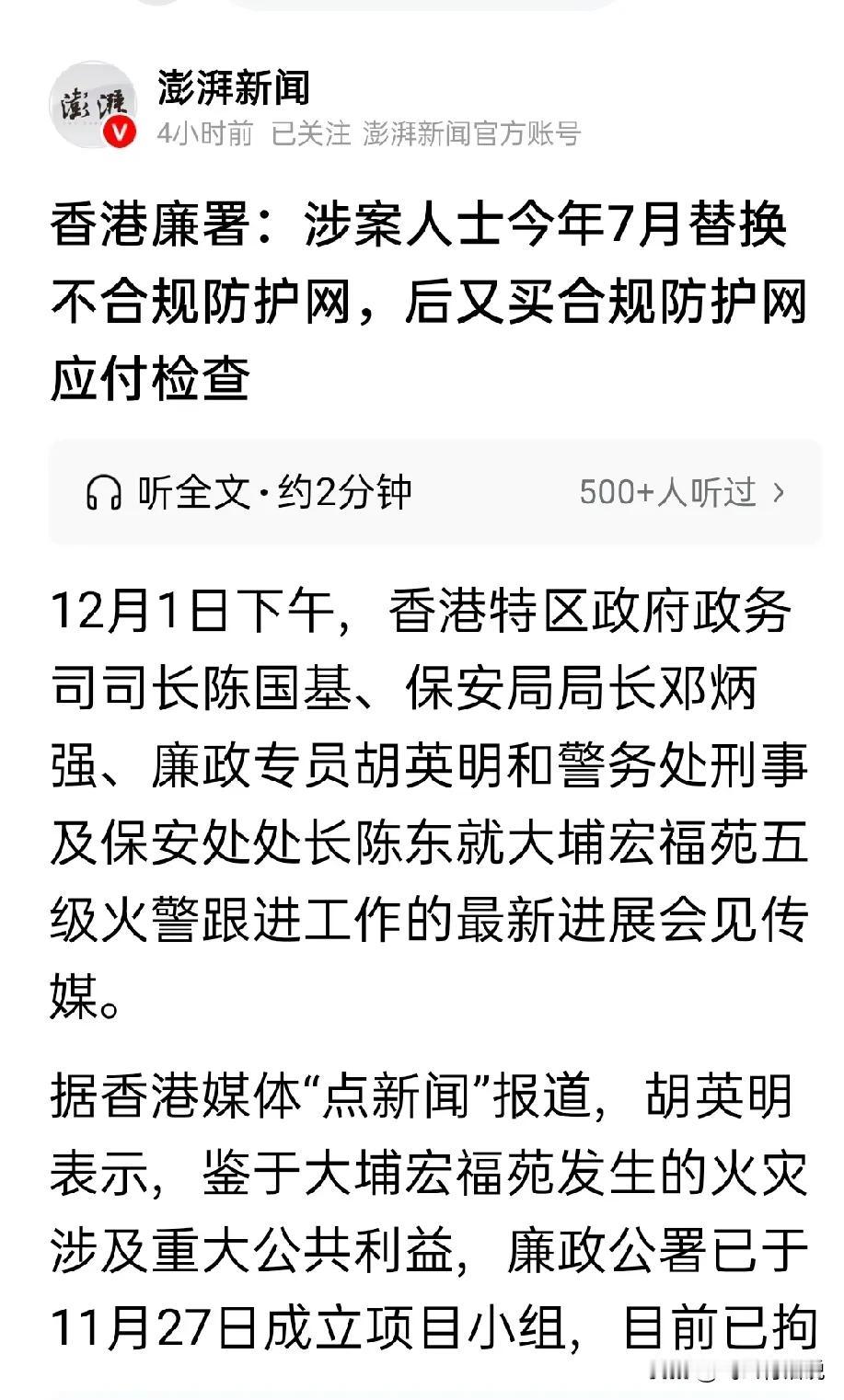 不得不佩服廉政公署的高效,防护网的质量问题立马搞清,抓人也很迅速 看来以次充好,弄虚作假,在香港也存在这样的现象 只不过这一次造成这么大的损失,依照香港的法律,估计有人要老死狱中了 只是不知道这种不阻燃的防护网厂家会不会也被追责索赔
