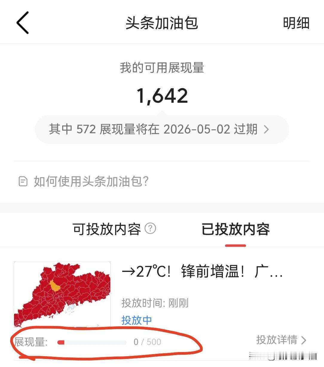 中午发布了一篇文章《北方寒潮来袭!广东:气温不降反升!周三起中等偏弱冷空气抵达》,过去两个多小时,展现量跟阅读量都不理想,于是投放了500的流量包,也是毫无起色! 万般无奈之下,又稍作修改了一番。 直到现在看来,都没有用。 算了!爱咋咋地吧!不折腾了! 明天继续再写吧!今天这篇算是废了! [我想静静][捂脸][笑哭][强][捂脸][笑哭][我想静静][强]