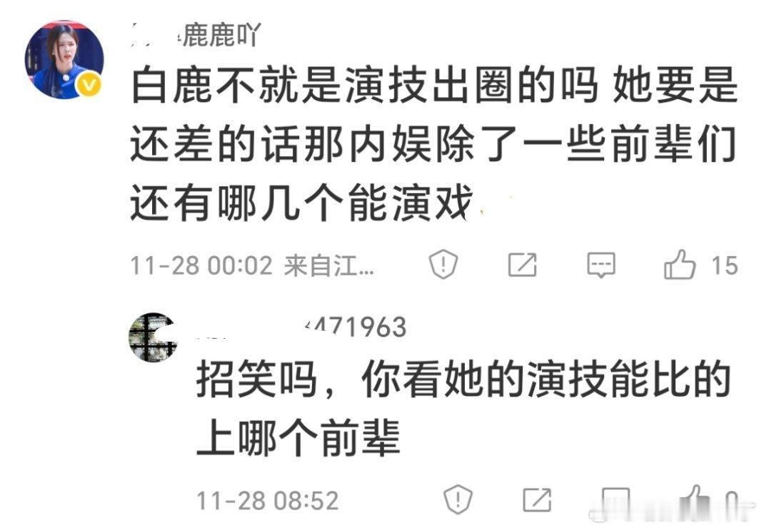 “鹿姐不就是演技出圈的吗她要是还差的话那内娱除了一些前辈们还有哪几个能演戏????”不知道哪里来的自信