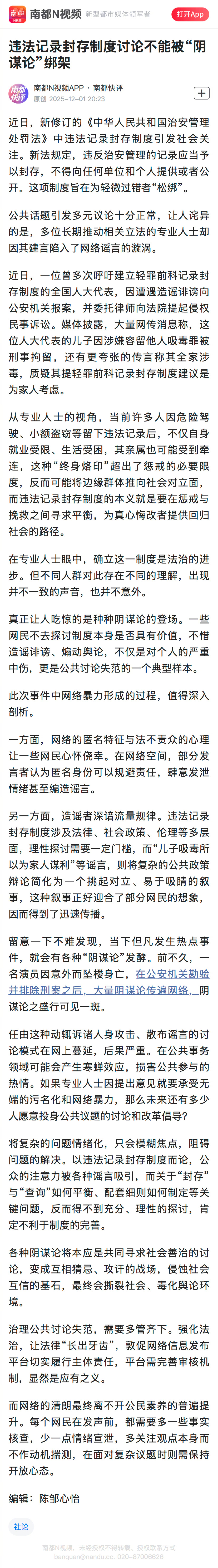 #公共讨论别被阴谋论绑架#【南都快评:违法记录封存制度讨论不能被“阴谋论”绑架】将复杂的问题情绪化,只会模糊焦点,阻碍问题的解决。以违法记录封存制度而论,公众的注意力被各种谣言吸引,而关于“封存”与“查询”如何平衡、配套细则如何制定等关键问题,反而得不到充分、理性的探讨,肯定不利于制度的完善。各种阴谋论将本应是共同寻求社会善治的讨论,变成互相猜忌、攻讦的战场,侵蚀社会互信的基石,最终会撕裂社会、毒化舆论环境。治理公共讨论失范,需要多管齐下。强化法治,让法律“长出牙齿”,敦促网络信息发布平台切实履行主体责任,平台需完善审核机制,显然是应有之义。而网络的清朗最终离不开公民素养的普遍提升。每个网民在发声前,都需要多一些事实核查,少一点情绪宣泄,多关注观点本身而不作动机揣测,在面对复杂议题时则需保持开放心态。