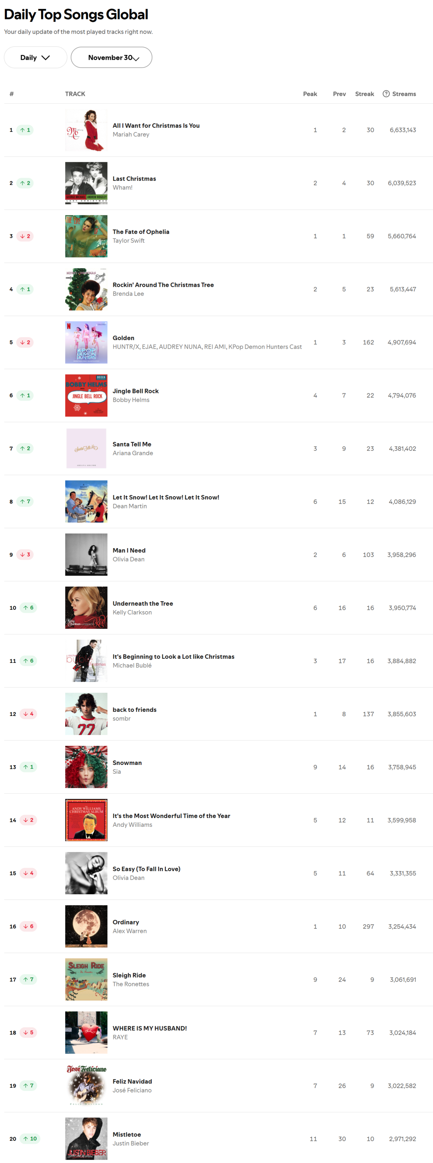 牛姐回冠了!感恩节一过就是圣诞节!今天的Spotify全球榜上,牛姐Mariah Carey圣诞神曲All I Want for Christmas Is You以663万3143次流媒体回冠!接下来将开启霸榜模式啦!不仅如此,Top 10里多达7首歌、Top 20里则有13首是圣诞歌!根本就挡不住了!!!