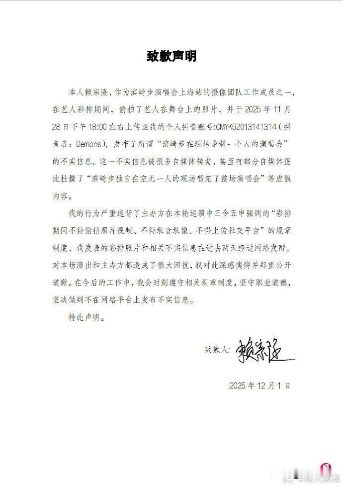 【所谓“一个人演唱会”竟是恶意谣言!造谣者动机极其不纯,务请严查严惩】滨崎步上海演唱会取消后,“一个人空馆独唱”的照片刷屏网络,网友纷纷感动泪目。但真相来了!涉事人赖宗隆公开道歉,承认偷拍彩排照,恶意编造假新闻,导致全网被耍。一个蹦年看,他承认是为流量吃“艺人红利”,趁演出取消制造谣言;恶意扭曲事实,让主办方背锅;钻空子蹭热点,无视职业道德。但是,从另一个层面看,在中日关系紧张、敏感之际,他竟敢故意发布这类不实信息,动机绝对极其不纯!而且,已经在国际上已经完成无法挽回的影响!因此,我建议必须对个人严查、严惩!同时,主办方应起诉索赔,平台封禁账号,行业列入黑名单。网络不是法外之地,造谣者必须付出代价!支持的转起!中日关系 滨崎步上海演唱会 来源:联合早报网