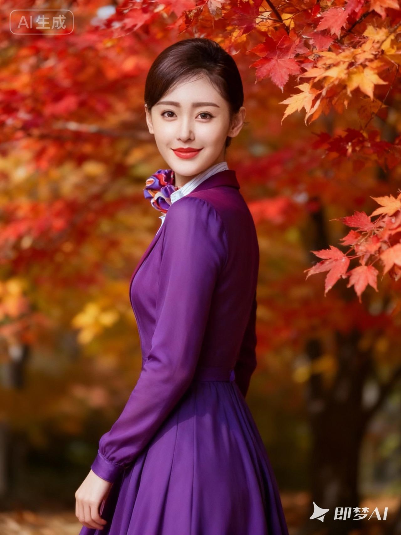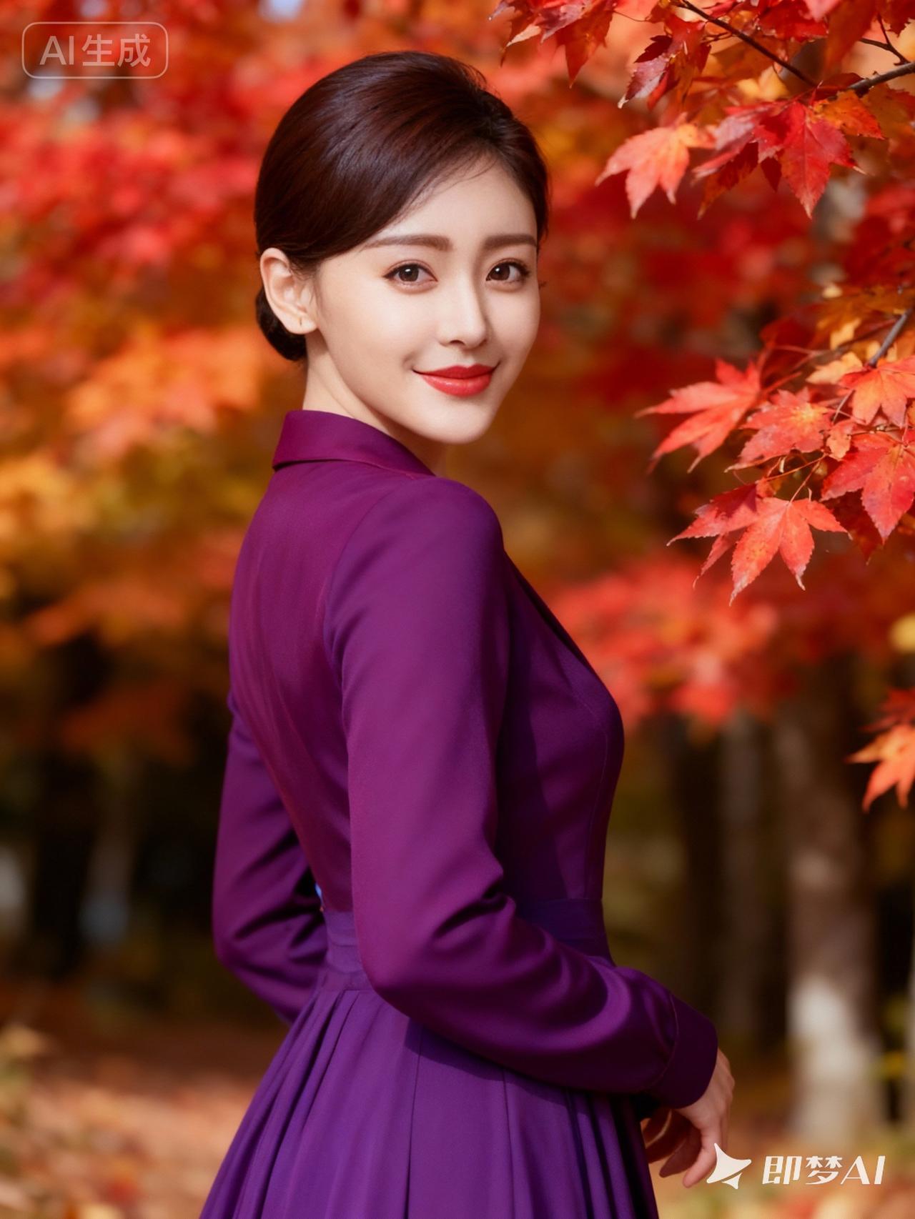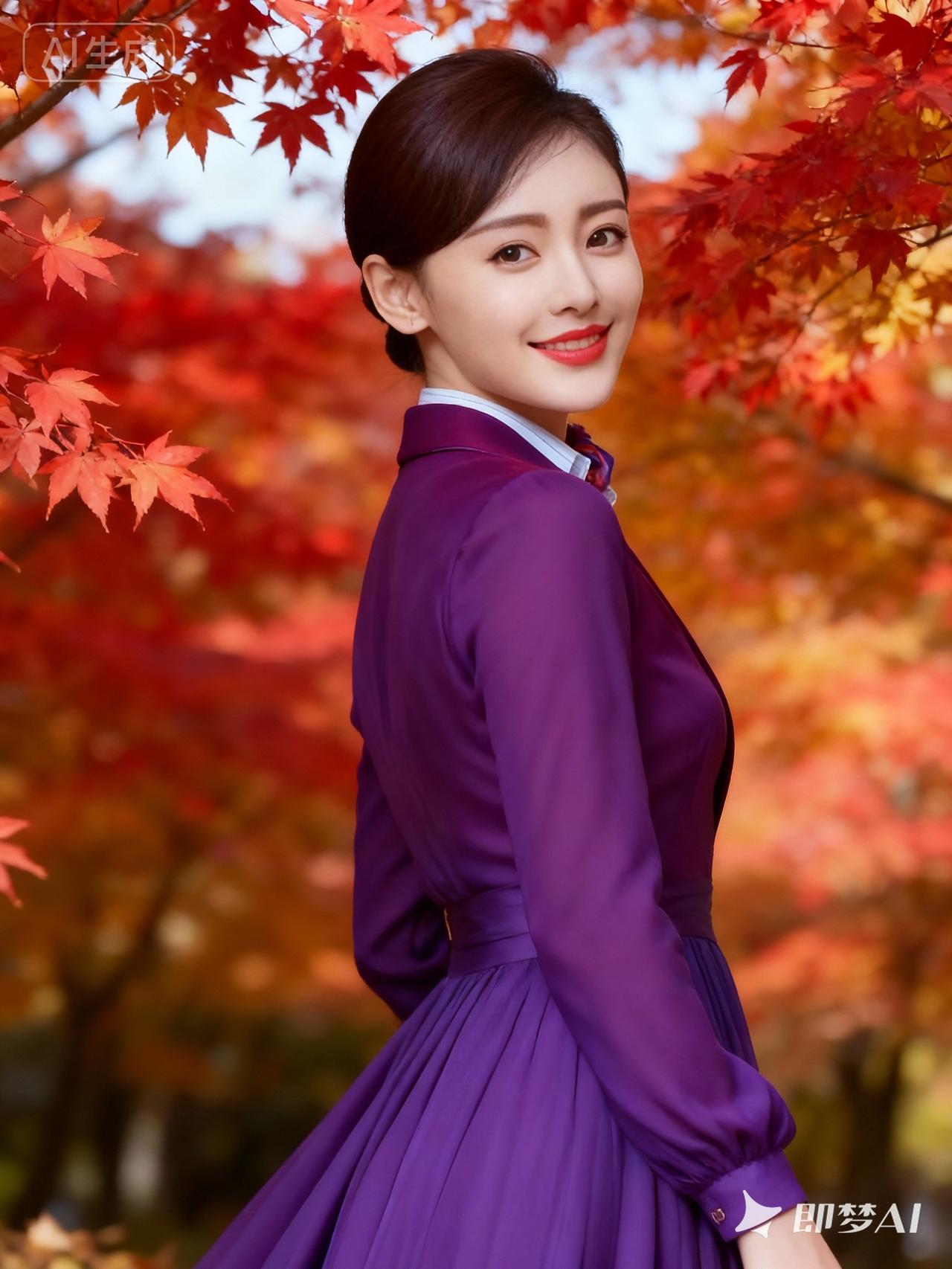 秋日暖阳下,红叶与紫裙相映成趣,优雅动人。