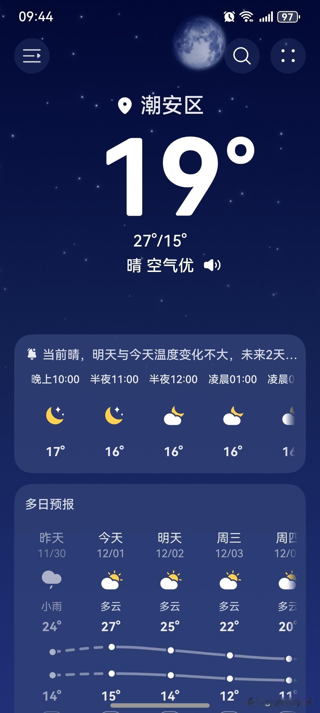 寒潮继续影响东北地区黄淮等地,局地降温20℃,多地将迎下半年来最冷一天,留意添衣保暖,防范流感。 今天(12月1日)继续发布寒潮蓝色预警,我国多地将出现大风降温天气;12月2日前后,从东北至江南的大部分地区的气温将刷新下半年新低。 新冷空气正逼近广东,2日夜间~3日逐渐影响广东,粤北市县日平均气温下降4~6℃,其余市县下降3~4℃,粤北最低气温降至6°℃左右。 不过,降温之前,广东先上一波升温。每逢冷空气来临之前,总会有锋前增温,这次也不例外,明天接着奏乐接着舞! 今天(1日)潮州喜提一个晴天,气温15~27℃,此刻气温19℃,体感温度18℃。 今天一整天都是天气晴好,气温极速上升,居然一下子攀升到27℃。这么热的天,你就说应不应该穿短袖?不过,早晚还是有点凉了。 明天继续25℃暖暖的,后天开始,冷空气抵达广东,气温也该下降了!