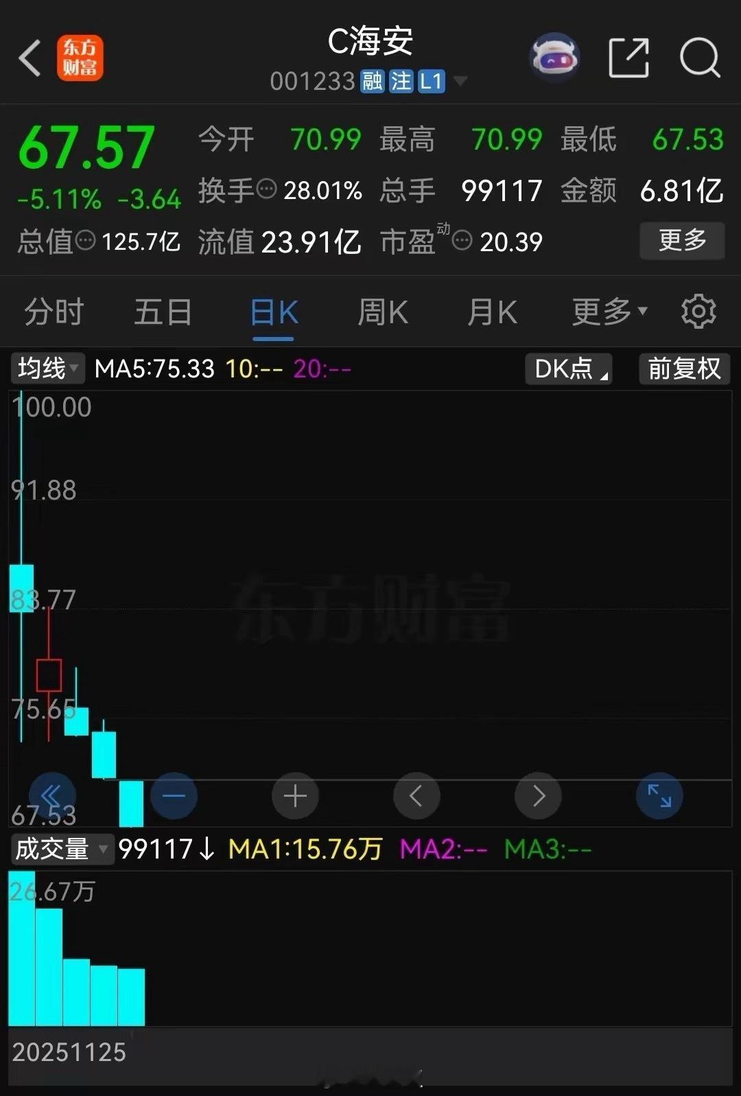 还敢买新股吗?看看这走势惨不惨?上周才上市的海安集团,发行价48元,上市当天被拉到最高100元,随后开始连续崩盘式下跌,今天是上市第五天,股价最低跌到了67.53元,收盘时几乎快以最低价收盘价了。上市5天下跌4天,除了上市第一天是上涨的,但也是高开低走收的是阴线,剩下四天持续下跌,股价不断见新低,目前已经较上市首日的高点下跌32%,二级市场上参与的股民全部被套住,无一幸免!因为新股上市前五天没有涨跌幅,很多人都想着博一博,单车变摩托,幻想着一夜暴富。殊不知现在的新股上市就是巅峰,一天就把一辈子的路走完了,你只要出价,它恨不得把公司都卖给你!让你宝马进去,自行车链条出来!