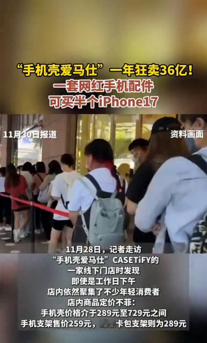 "手机壳爱马仕"一年狂卖36亿!一套网红手机配件可买半个iPhone17。 11月28日,记者走访"手机壳爱马仕"CASETiFY的一家线下门店时发现,即使是工作日下午,店内依然聚集了不少年轻消费者。 店内商品定价不菲:手机壳价格介于289元至729元之间,手机支架售价259元,磁吸卡包支架则为289元。单价高达500元、年营收达36亿元的CASETiFY手机壳正凭借"手机壳中的爱马仕"的定位成为一线中产消费者追捧的轻奢新宠。 记者发现,不仅是CASETiFY,手机配件圈已出现多个高端品牌,popsockets气囊支架+CASETiFY手机壳+String Ting手机链,配齐这样一套网红手机配件竟然要花3000多元,足以购买半部标准版iPhone17。 编辑:殷子昂,审核:方昌林。