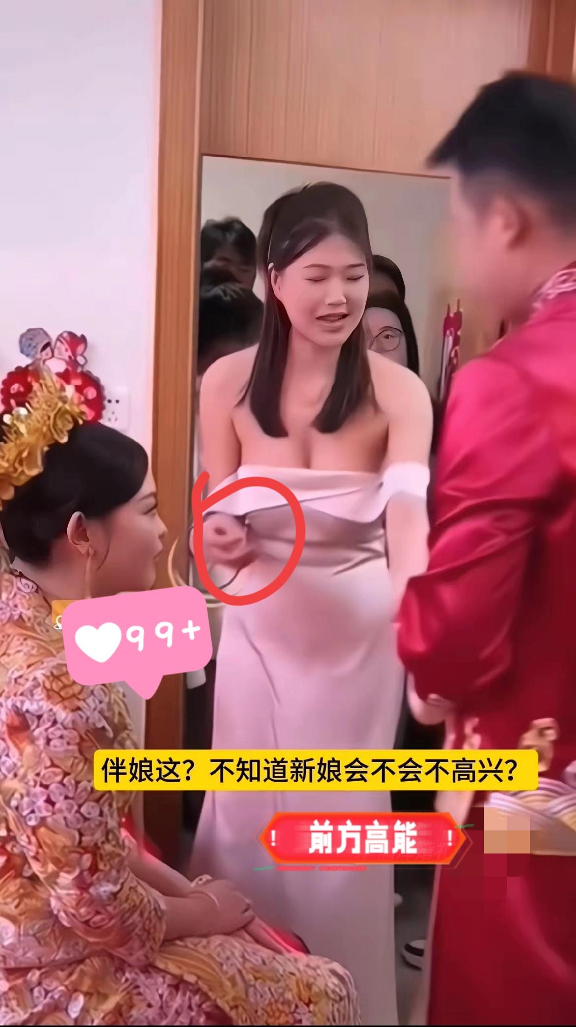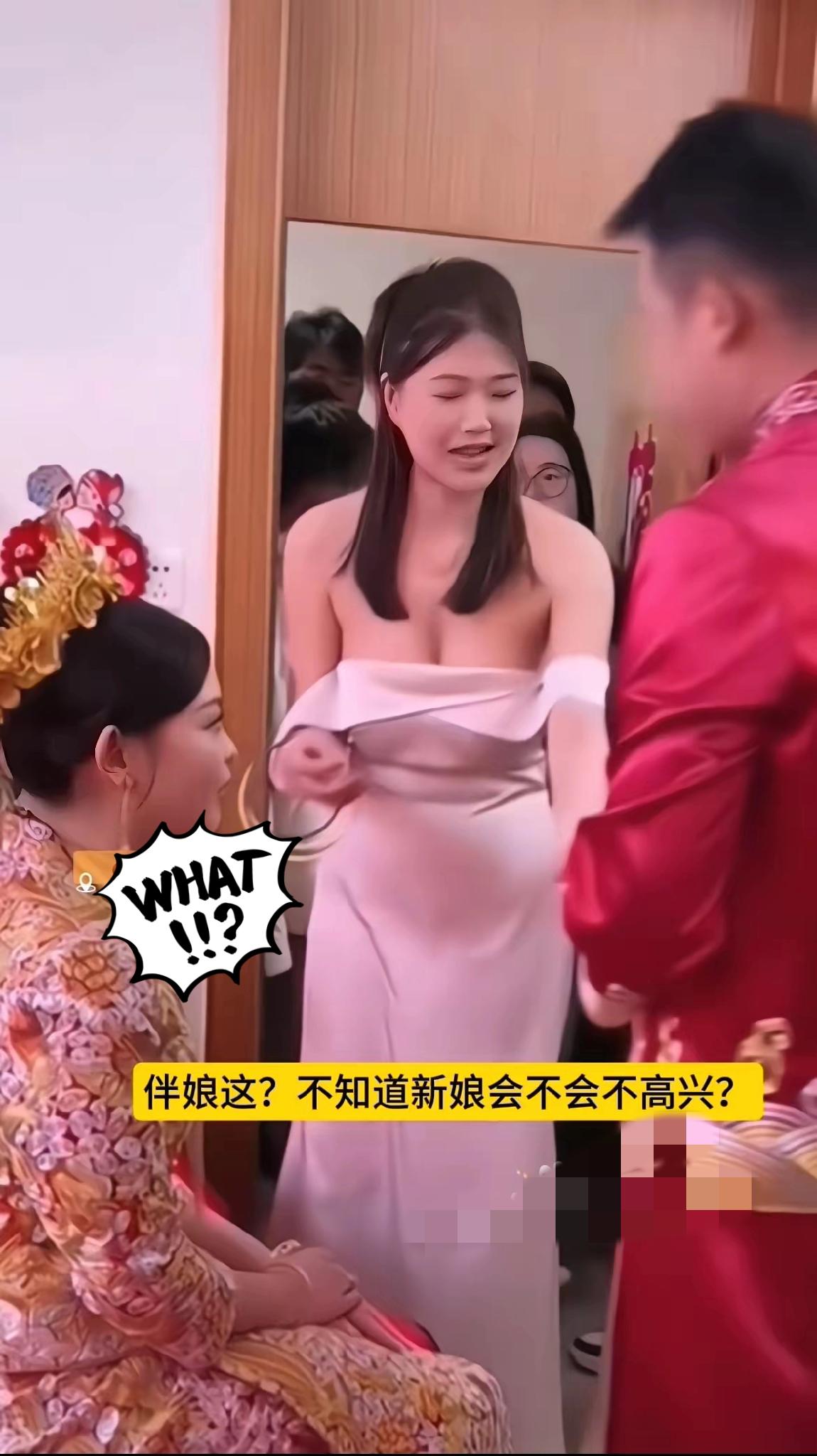 露肤度太多了! 刷到的这场婚礼视频真的让人看不懂, 伴娘穿的低胸一字肩都快掉到肚子上,露得明明白白抢尽风头,连新郎都看呆了,全程跟新娘互动都心不在焉。这裙子明明能把肩带拉上去显气质,偏要故意往下拽,甚至连伴娘该戴的胸花都没戴,在场不管男士还是女士,目光全被她吸引,反倒把当天的主角新娘给晾在了一边。 其实穿衣自由从来都不是没边界的放纵,尤其是在婚礼这种有明确主角的场合,伴娘的职责本就是衬托新娘、搭把手帮忙,而不是来开个人时装秀。之前也见过穿红裙、跳艳舞抢镜的伴娘,最后闹得大家都尴尬。 所谓的场合分寸,本质上就是成年人的社交修养——再爱美也得懂,别人的重要时刻,收敛锋芒才是对人的基本尊重。你参加婚礼时见过更离谱的抢镜操作吗? 要是你结婚,会提前跟伴娘约定穿搭要求吗?