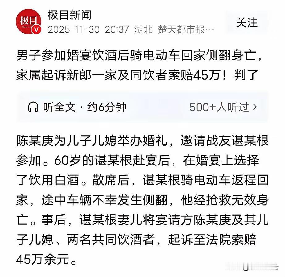 “想钱想疯了?” 江西宜春这场婚宴纠纷, 法院两审判决太提气! 60岁战友参加老战友儿子婚礼,自斟自饮2两白酒,散席后骑电动车侧翻身亡,家属转头就把宴请方和同饮者告上法庭,索赔45万余元。可这事从头看,压根没人家的责任,席间没人劝酒灌酒,都是自己倒酒喝,死者血液酒精含量远没到醉驾标准,散席时也没任何醉酒异常,就连死因都因家属拒绝解剖没法明确。 这事儿最关键的不是人情,而是法律讲的举证责任和自我负责。别觉得一起喝酒出事就能讹上同桌,法律从来不是“和稀泥”,没有劝酒、没未尽到照顾义务,就不该为别人的自主选择买单。家属这种遇事就想找别人兜底的想法,不仅寒了战友的心,还会让大家对聚餐喝酒越来越忌惮。 你觉得遇到这种事,家属该怎么做才合理?要是你参加婚宴,会主动拒绝喝酒吗?
