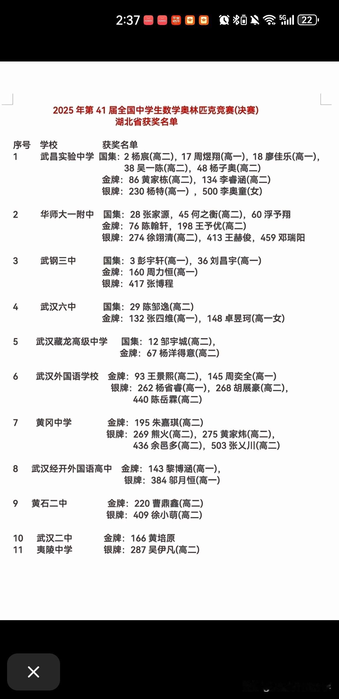 华中师大一附中官宣2025CMO3国集5金3银 华中师大一附中王者归来, 这次的表现可圈可点, 依靠自己强大的数学底蕴再现辉煌, 派出的选手都是精兵强将, 华师一附中一共出征了8位选手, 就获得了3国集5金的好成绩, 国集率也是高达37.5%, 国集人数全国排名第五。 华师一附中数学竞赛基本是靠自身培养的, 而不是和许多学校直接选择和机构合作, 华师一附中的数学底蕴由来已久, 多年来也培养了许多IMO和CMO选手。 其实从如今的数学竞赛的格局来看, 竞争是越来越激烈了, 国集和金牌的差距都在毫厘之间, 国集线今年是87分加权,金牌线是78分。 而从今年的分数来看全国排名第13名 的同学的分数已经是93分了, 也就是说从13名到60名分差就有6分而已, 而一个得分点是3分,也就差2个得分点, 也就是说高手之间对决的差距就是少犯错。 竞赛训练目的就是让大家都形成条件反射, 看到题目就能在脑海中快速反应, 找到最合理最优的解法, 而求解的过程要力求缜密和少失误。