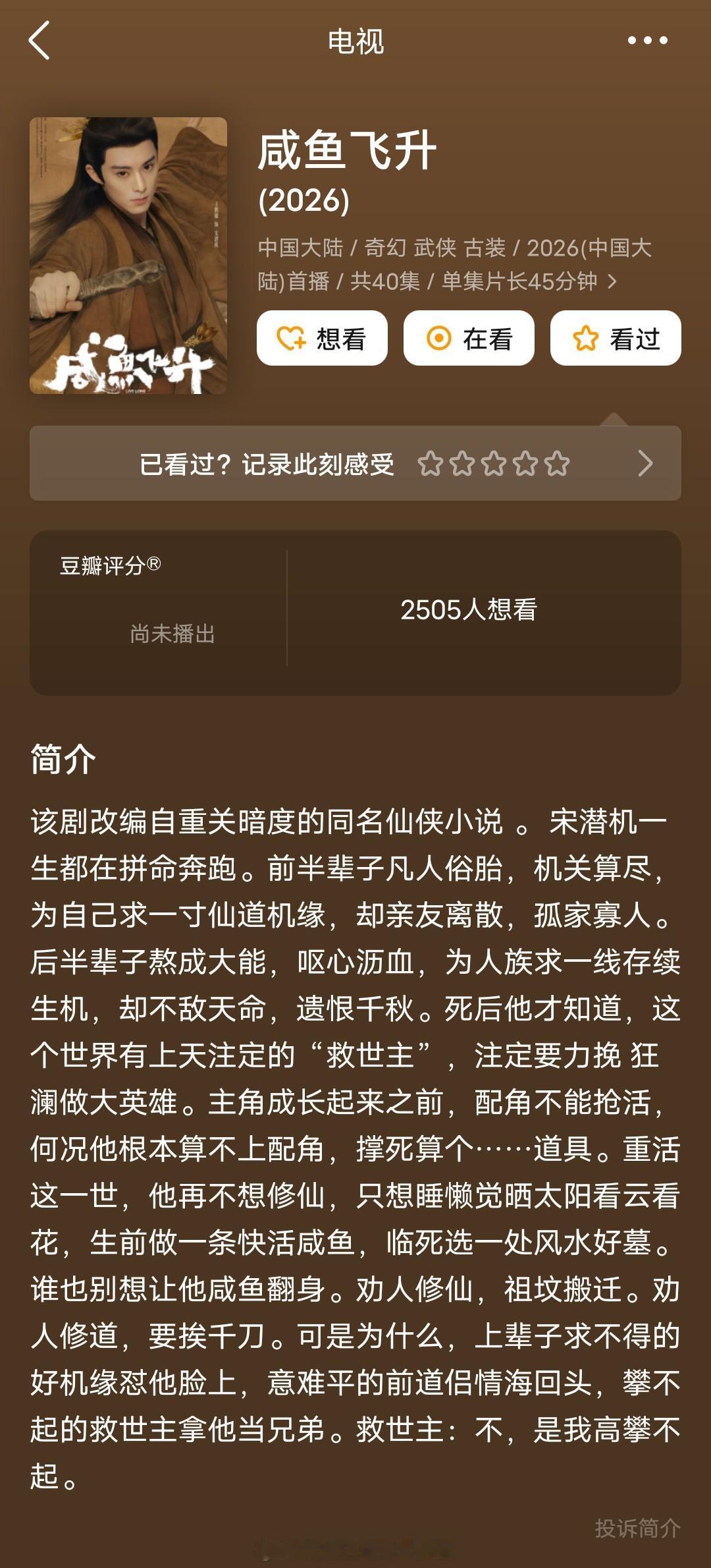 王鹤棣《咸鱼飞升》芒果S++,暂定26年双11档期,瓜主爆料咸鱼是平台押宝的重量级大剧,直接给了招商最好的档期。