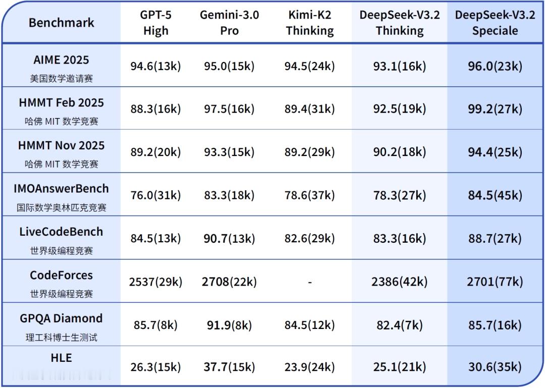 DeepSeek 今天憋了个大招——V3.2 正式版发布,而且一口气放出两个版本:标准版和 Speciale(特供版)。1)先来看标准版。定位很明确——适合日常使用、问答场景和通用 Agent 任务。核心卖点是「不水字数」:在推理类 Benchmark 上达到 GPT-5 水平 (仅略低于 Gemini-3.0-Pro),但相比 Kimi-K2-Thinking,输出长度大幅缩短。翻译一下就是:该说人话的时候不废话,计算开销和等待时间都大幅降低。然后就是 Agent 能力加持——这是 DeepSeek 首个将思考融入工具调用的模型。官方搞了个 1800+环境、85000+复杂指令的强化学习任务库 (解答、易验证类型),直接把模型泛化能力拉满。智能体评测成绩已经是开源天花板水平,跟闭源模型的差距在肉眼可见地缩小。2)Speciale 版:这版本更狠——长思考增强版+DeepSeek-Math-V2 定理证明能力加持。目标就一个:把开源推理能力推向极致、探索模型边界。来看看这个特供版的成绩:IMO 2025(国际数学奥林匹克)、CMO 2025(中国数学奥林匹克)、ICPC 全球总决赛、IOI 2025 全部金牌。其中 ICPC 拿到人类选手第二名、IOI 第十名。这个版本的代价是——消耗 Token 显著更多、成本更高。不过官方也明确表示 Speciale 版本仅供研究使用,不支持工具调用,也没针对日常对话优化,相当于说这是「解题神器但不适合闲聊」。