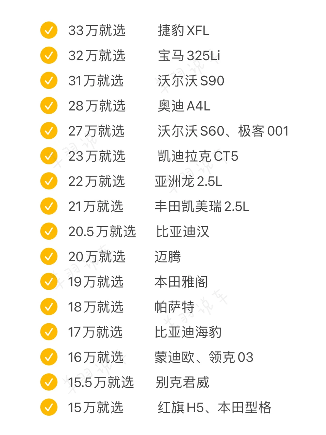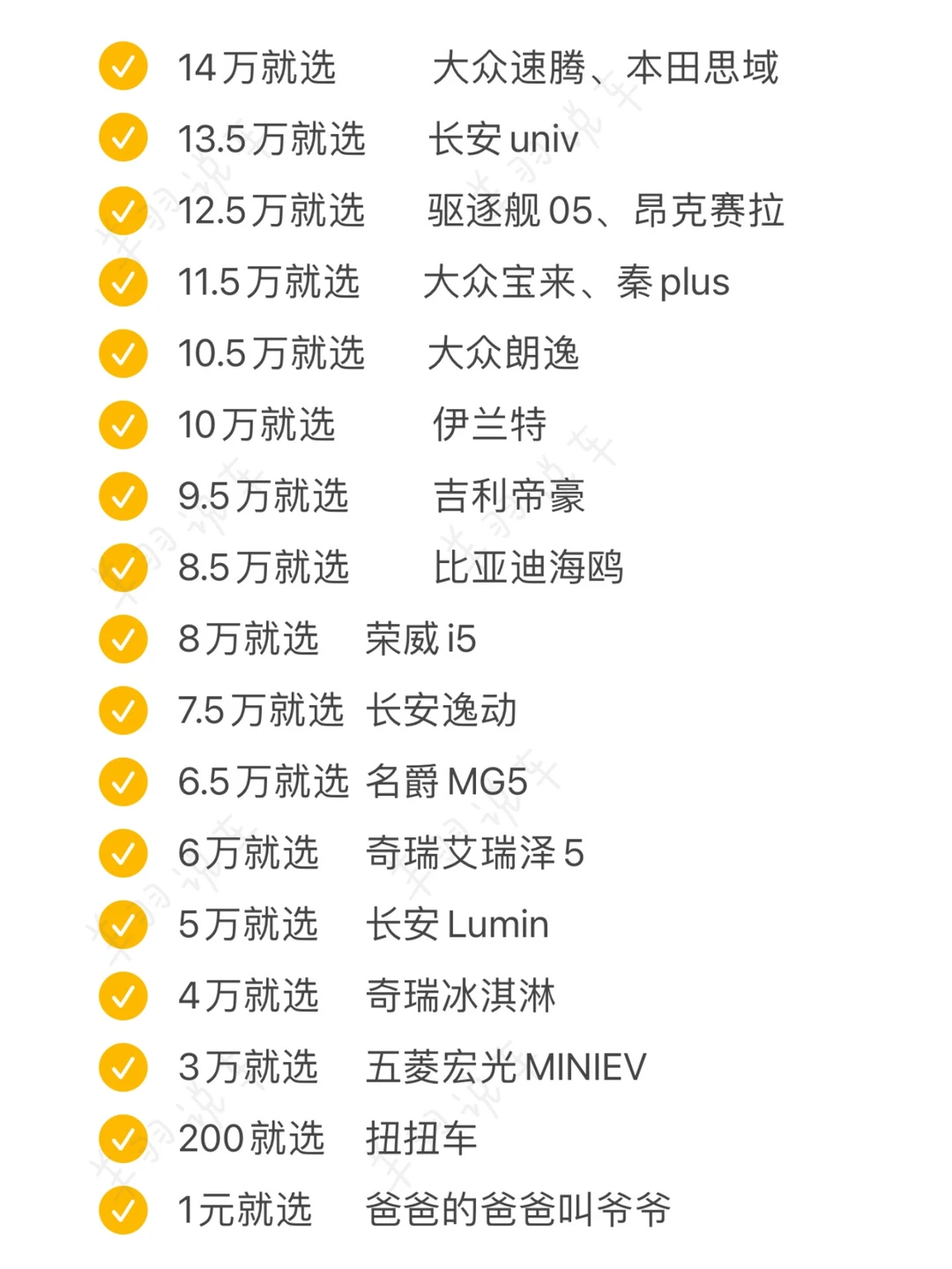 最讨厌给人选车了,每个人对车的要求都不同,就是一对一的选都不一定选的好,更何况这种列表。