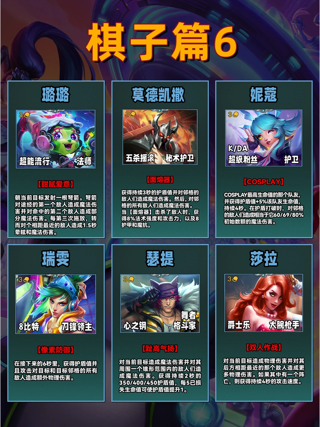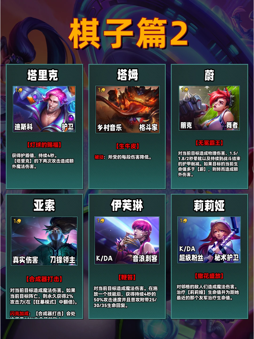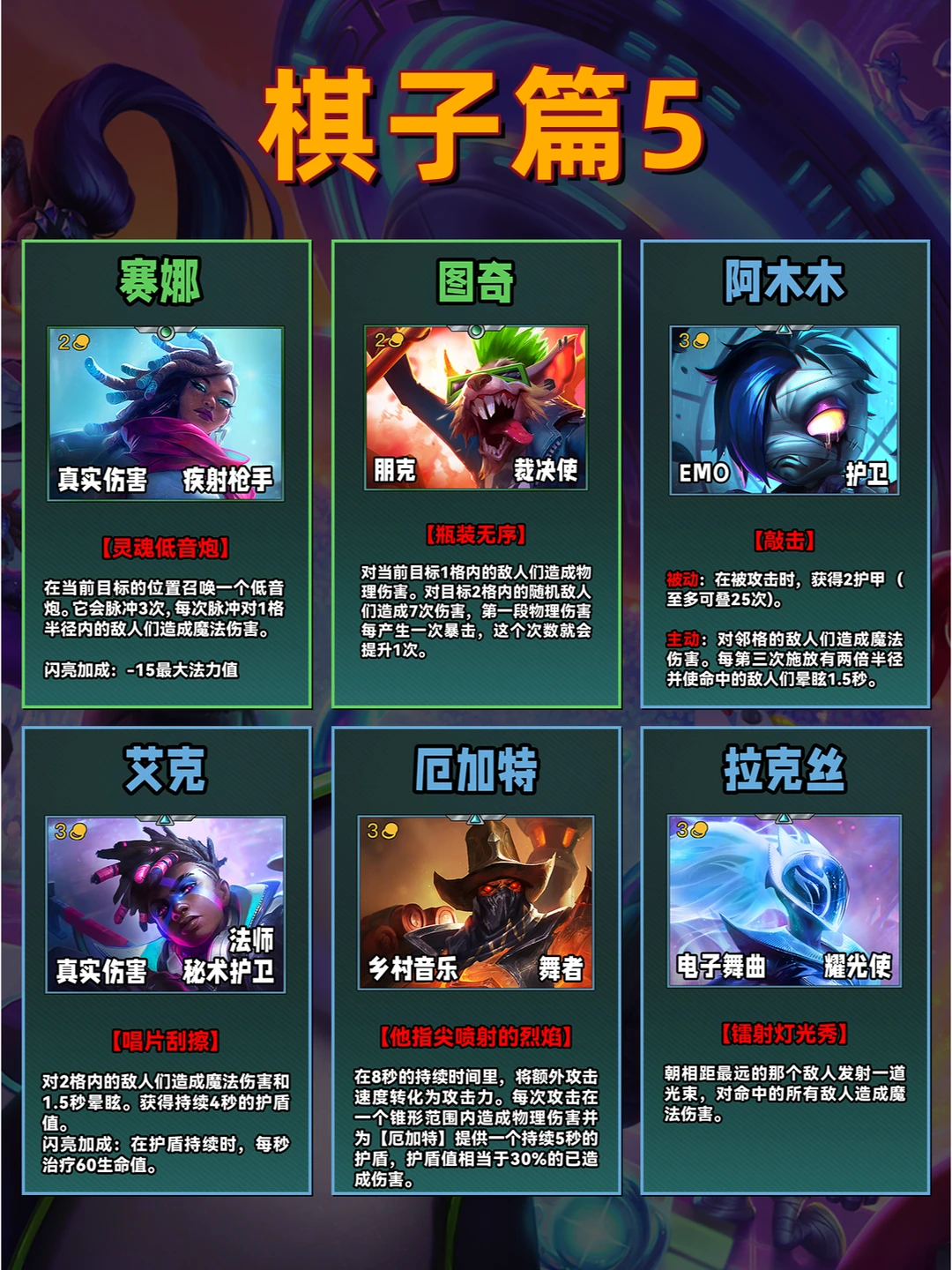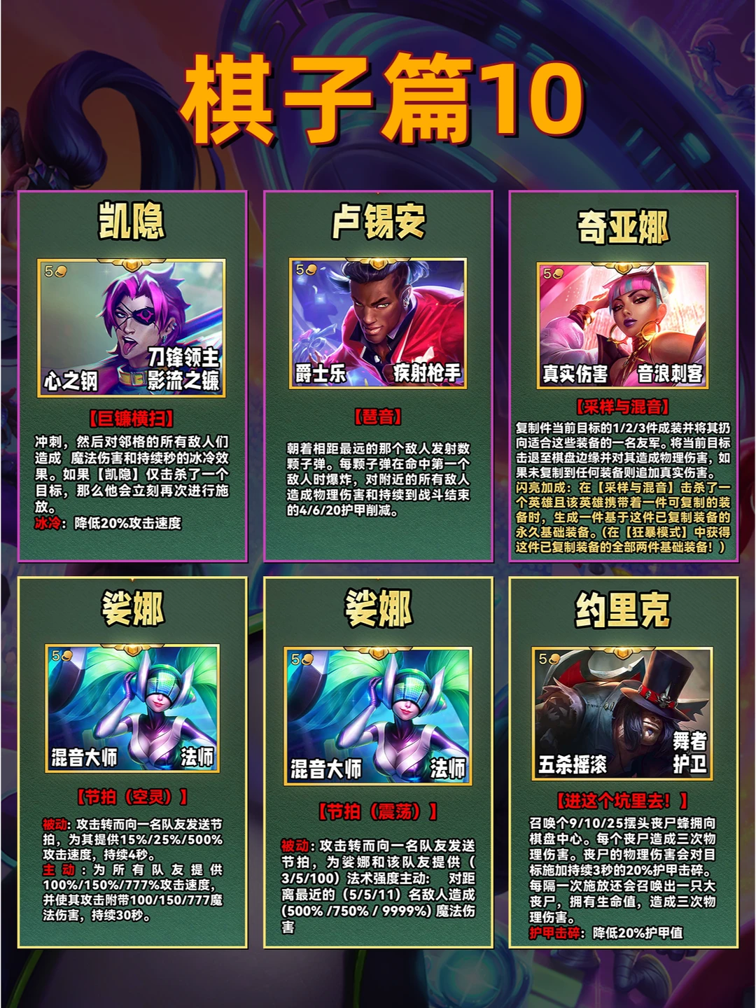 新赛季即将在11月23号上线 S10赛季主要为音乐主题🎶 不管是棋子皮肤、羁绊、技能都非常酷炫🥁 再也不会被人物给丑哭了哈哈 新赛季总共有60张棋子♟️ 1费卡、2费卡、3费卡、4费卡各13张 5费卡8张✅ 其中五费卡娑娜有三种形态🎹 想要新赛季尽快上手的赶紧看起来啦