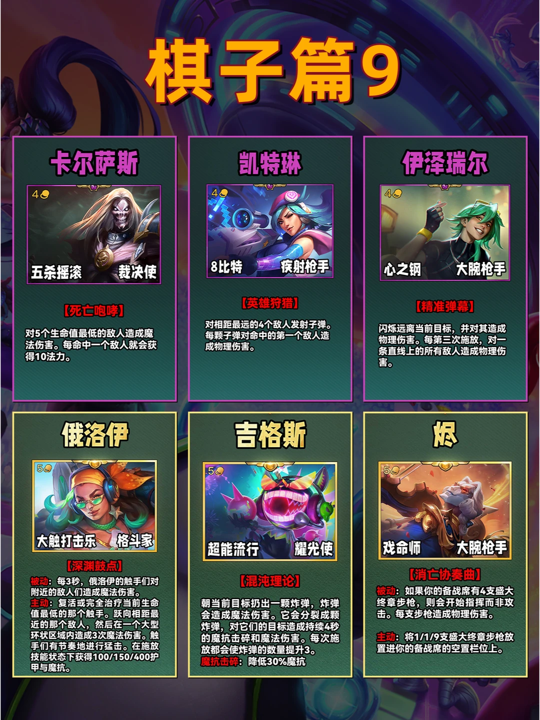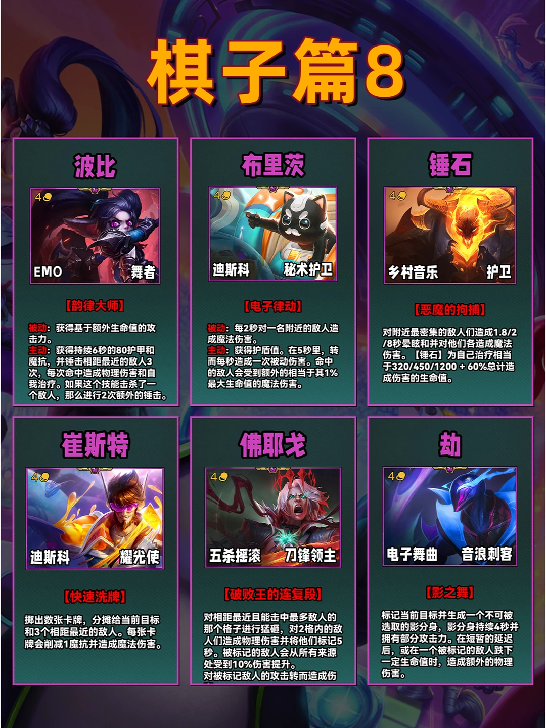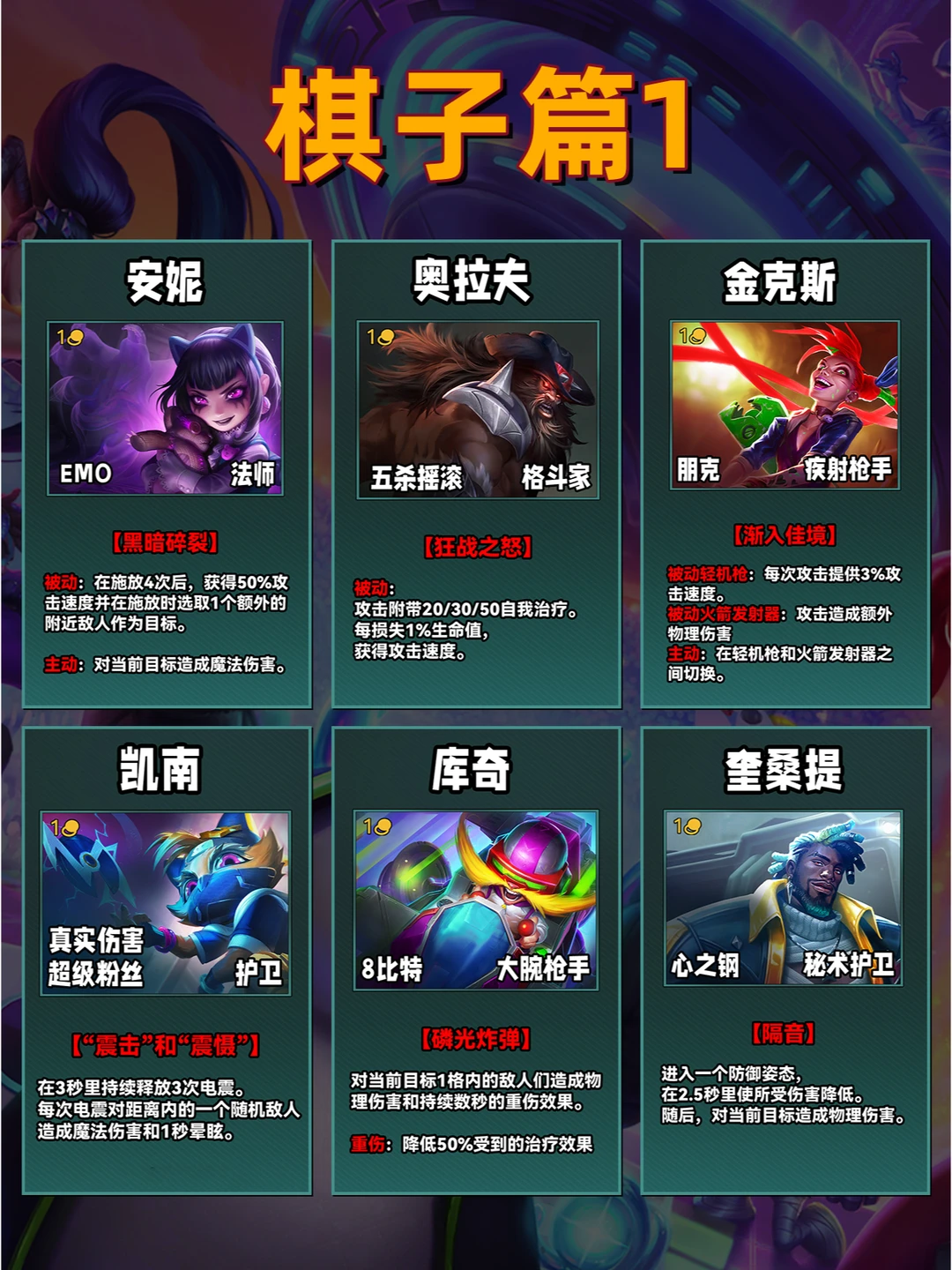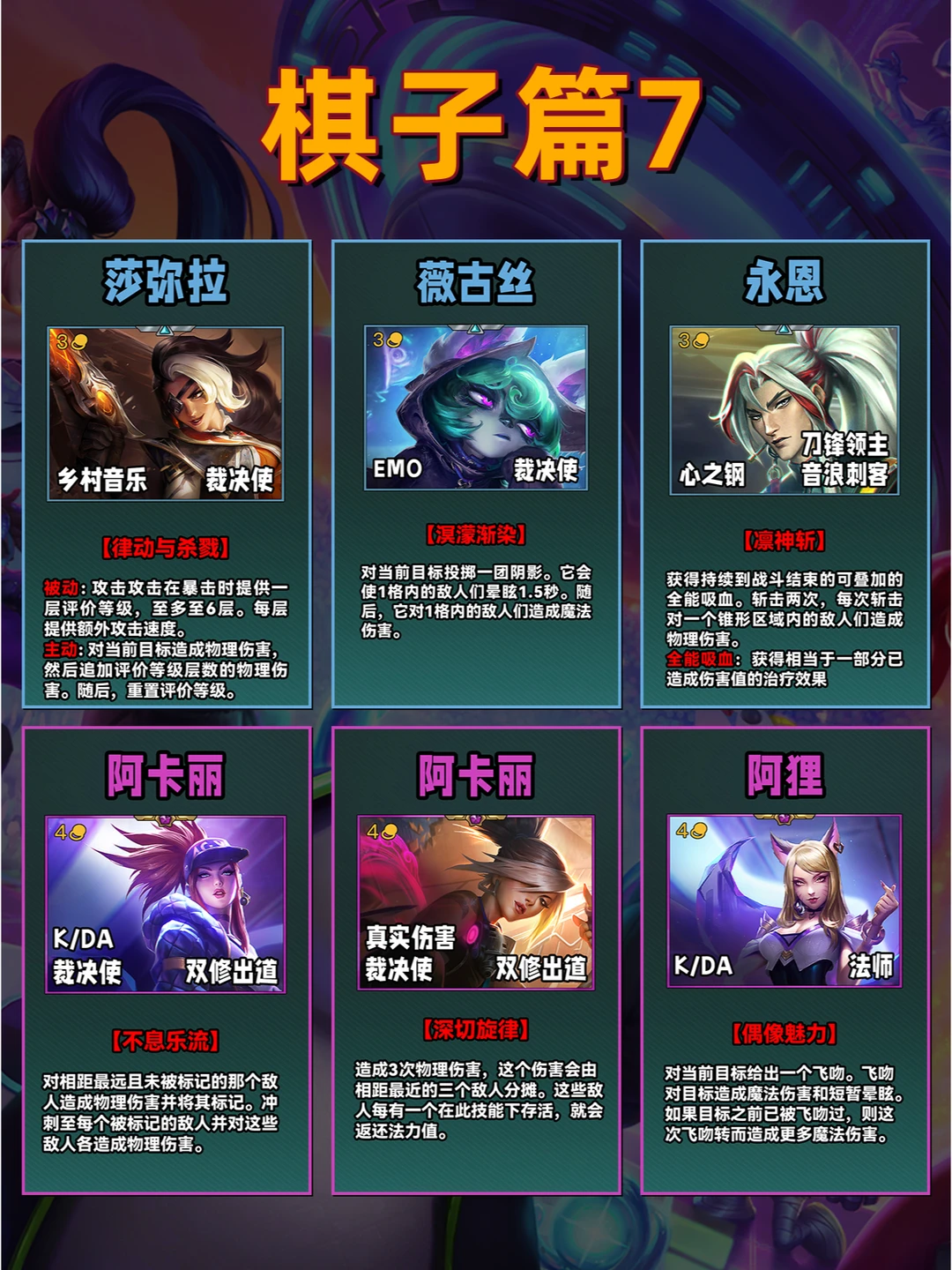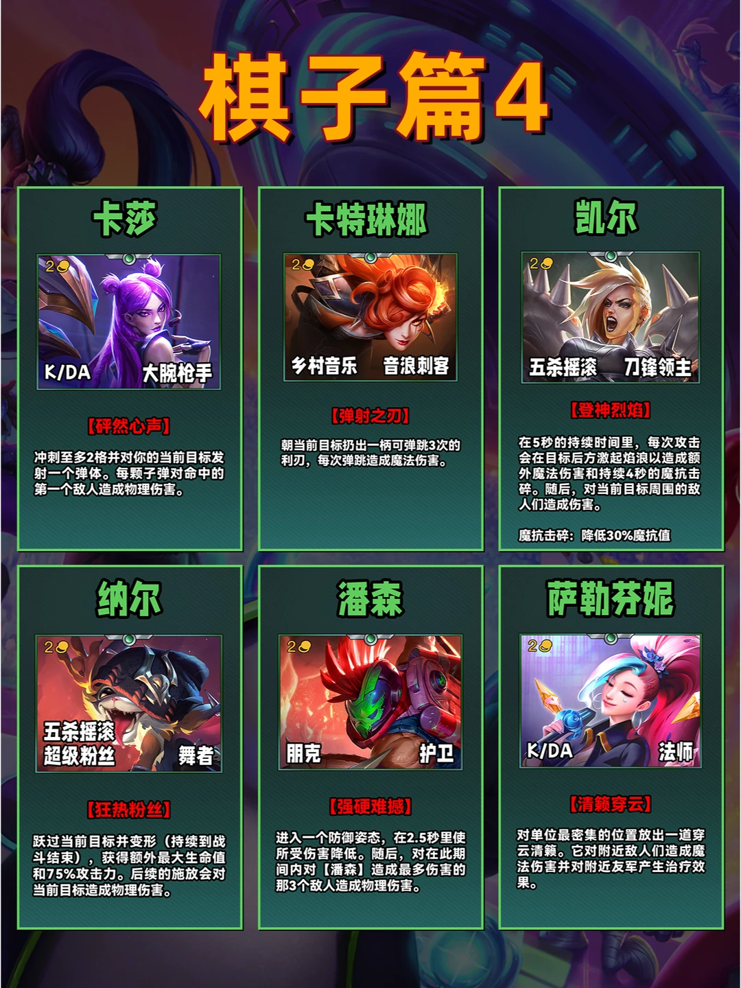 新赛季即将在11月23号上线 S10赛季主要为音乐主题🎶 不管是棋子皮肤、羁绊、技能都非常酷炫🥁 再也不会被人物给丑哭了哈哈 新赛季总共有60张棋子♟️ 1费卡、2费卡、3费卡、4费卡各13张 5费卡8张✅ 其中五费卡娑娜有三种形态🎹 想要新赛季尽快上手的赶紧看起来啦