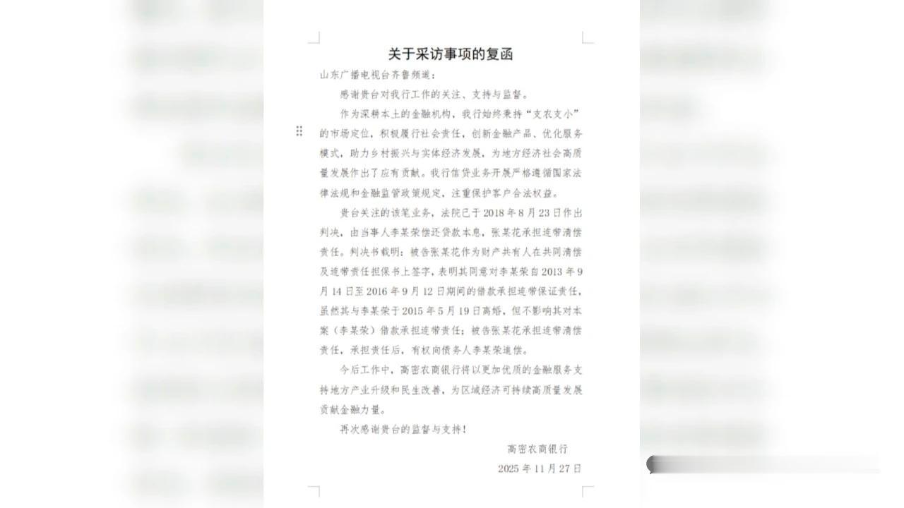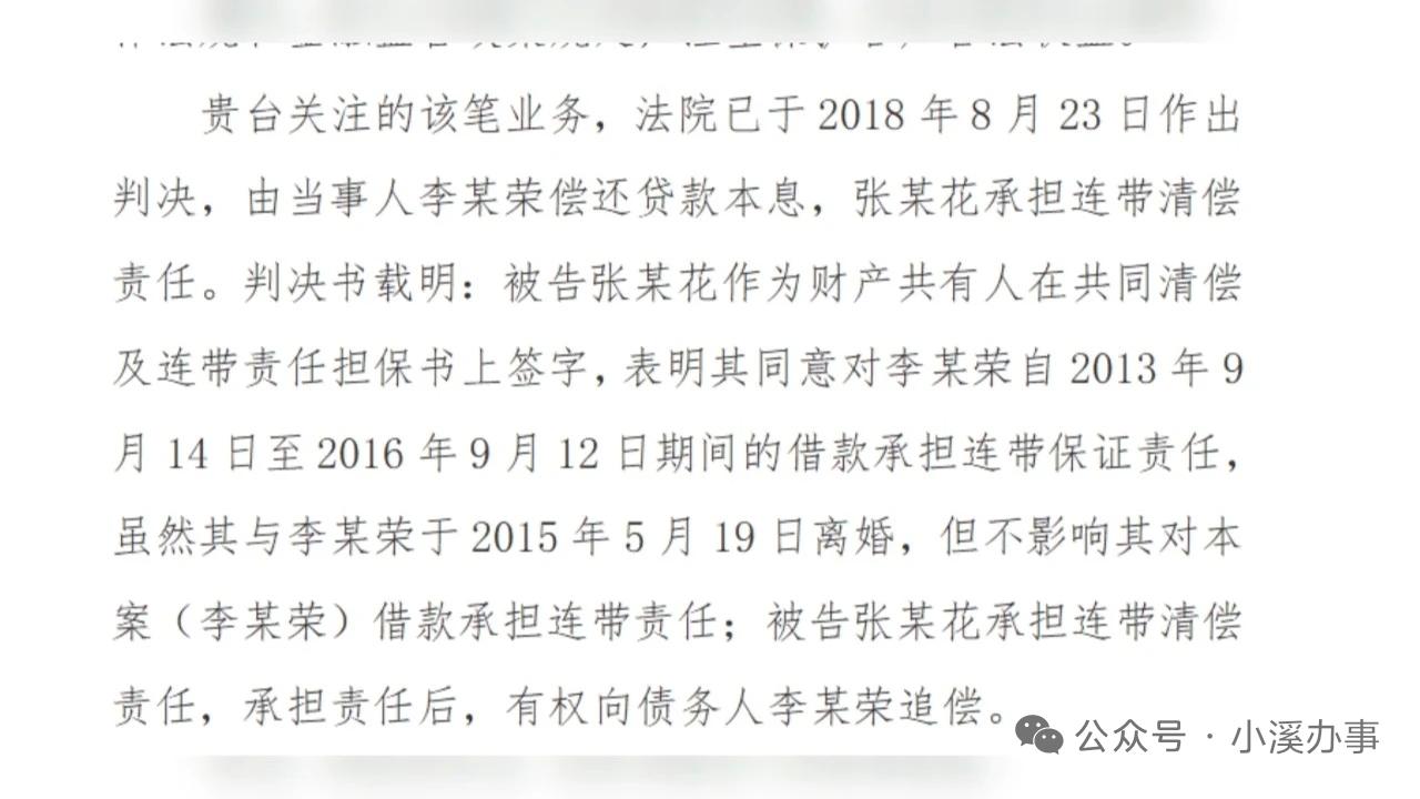 离婚十年,还得帮前夫还贷款? 上个月,山东潍坊高密的张女士收到一条银行扣款短信,自己账户里的15000块钱被突然扣除,而这笔钱竟然是给前夫扣划了贷款!这条短信让张女士非常不解,自己与前夫早在十年前就已经离婚,为何十年后自己还要为对方还钱? 2013年9月,张女士和当时的丈夫李某某一起向高密农商银行贷款了8万元,但到了2014年贷款到期,他们并没有将贷款还清,因此还上了银行的“黑名单”。2015年5月,夫妻俩将这笔贷款还清后,两人便离了婚。 离婚后,张女士本以为这段贷款经历已经结束,可让她没想到的是,当年7月份,李某某竟然以夫妻名义再次从银行贷了款,而且这笔钱一直没有还款。 整个过程中,有两件事张女士想不通,2014年李某某就因为拖欠贷款被列入了“黑名单”,为何一年后又能成功贷款?2015年5月两人离婚,2015年7月李某某为何还能以夫妻二人的名义办理贷款,而自己还成为了共同还款人? 带着这两个疑问,特派员和张女士一起前往办理贷款的高密农商银行李家营支行,见到了一位夏行长。夏行长称他们支行无权接受采访,但已经将情况反映给了上级部门的新闻发言人,特派员如果有采访需求,可以向高密农商银行股份有限公司了解情况。 特派员拨打了夏行长提供的电话,但无人接听。随后,特派员和张女士又赶到了高密农商银行股份有限公司。 高密农商银行股份有限公司新闻发言部门的一位工作人员出面解释了张女士的贷款情况。 原来,2013年9月,张女士与当时的丈夫李某某办理贷款的时候,曾签订了一份联保责任书,张女士是借款主体,夫妻二人是共同还款人。这是一份有效期三年的循环贷合同,也就是说从2013年9月至2016年9月期间,每一次将贷款还清后,他们都可以再次将贷款贷出循环使用,直至合同到期。因为有了第一次贷款时提交的各项资料,第二次贷款办理的程序更加简单,甚至都不需要张女士签字,这也就是张女士对第二笔贷款毫不知情的原因。 2015年7月,李某某办理第二次贷款时,张女士签署的联保责任书还在有效期限内,所以对第二次贷款仍然负有共同还款责任。 而对于张女士质疑的,2014年李某某就已经被列入“黑名单”,为何2015年还能继续办理贷款业务。这位工作人员称将记录问题并联合其他部门共同调查。 采访结束后的第三天,特派员收到了高密农商银行股份有限公司的书面回复材料:被告张某花作为财产共有人在共同清偿及连带责任担保书上签字,表明其同意对李某荣自2013年9月14日至2016年9月12日期间的借款承担连带保证责任,虽然其与李某荣于2015年5月19日离婚,但不影响其对本案(李某荣)借款承担连带责任;被告张某花承担连带清偿责任,承担责任后,有权向债务人李某荣追偿。 对于张女士的问题,特派员也专门咨询了律师。 律师刘善鹤: 从目前查明的情况来看,从张女士账户扣款是法院基于胜诉判决采取的强制执行措施,根据判决书的判决结果,张女士需要对这笔贷款承担连带责任,从这个角度来看,银行并没有过错,张女士可以在承担连带责任之后再向实际借款人追偿。张女士如果认为法院的判决书存在错误,也应当先配合执行。而后呢,再通过审判监督程序,申请上级法院或者检察院对案件进行审查。 来源 小溪办事