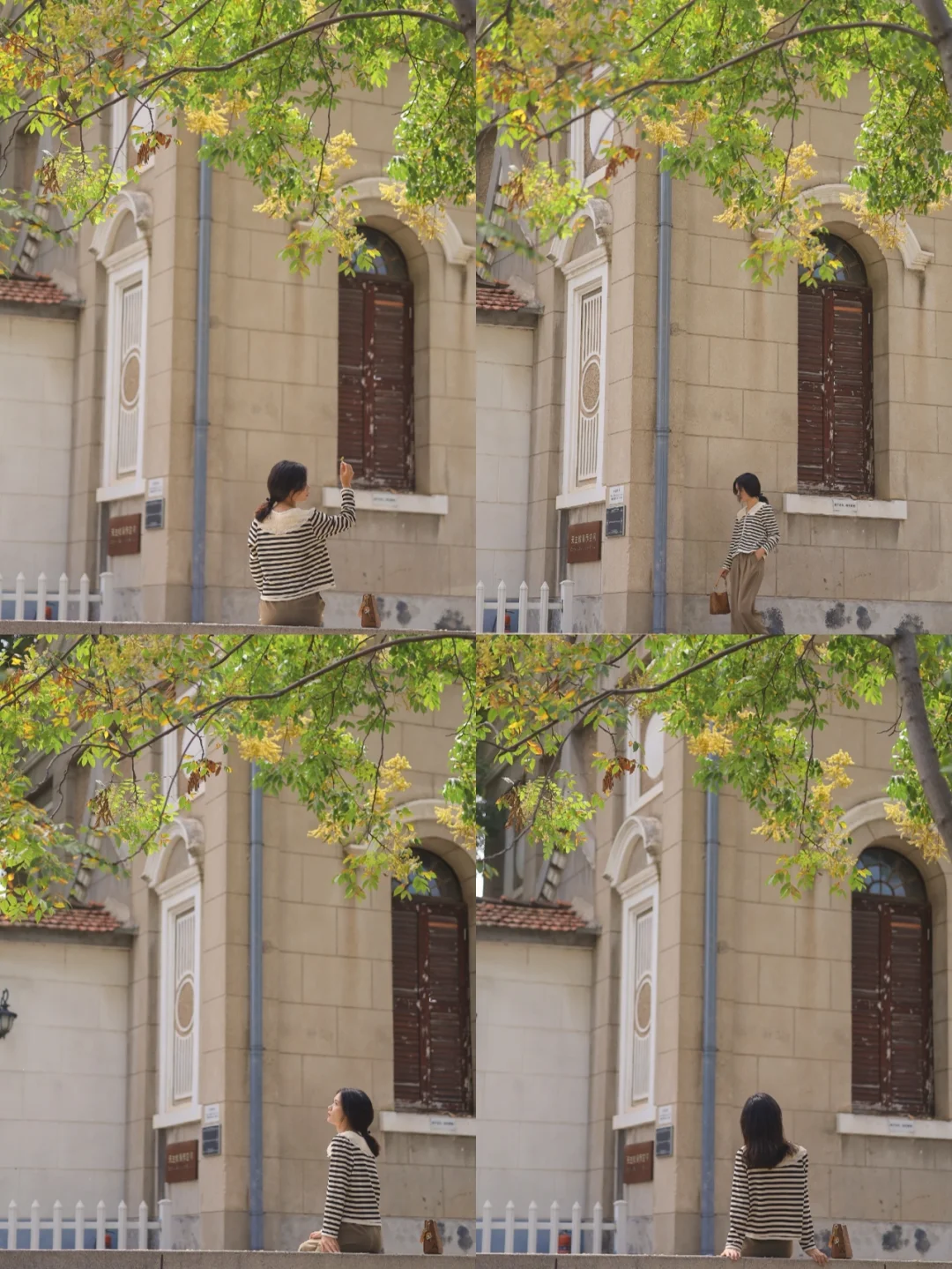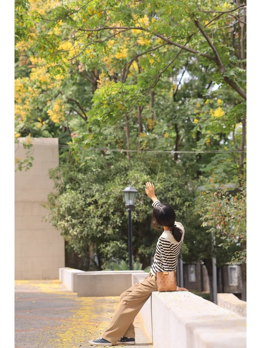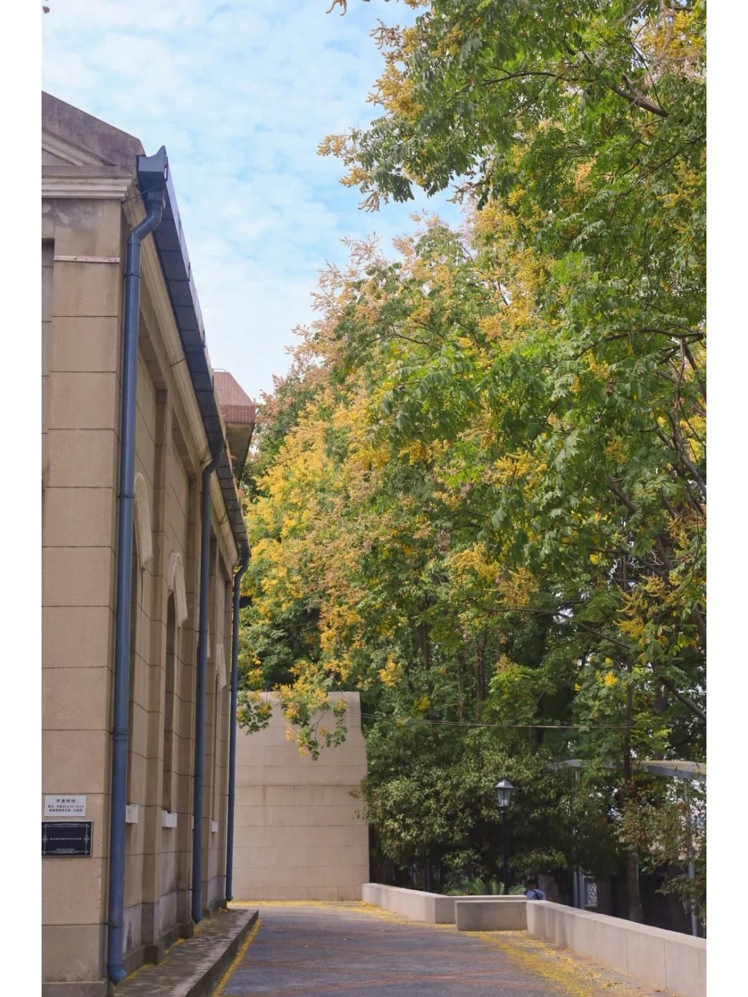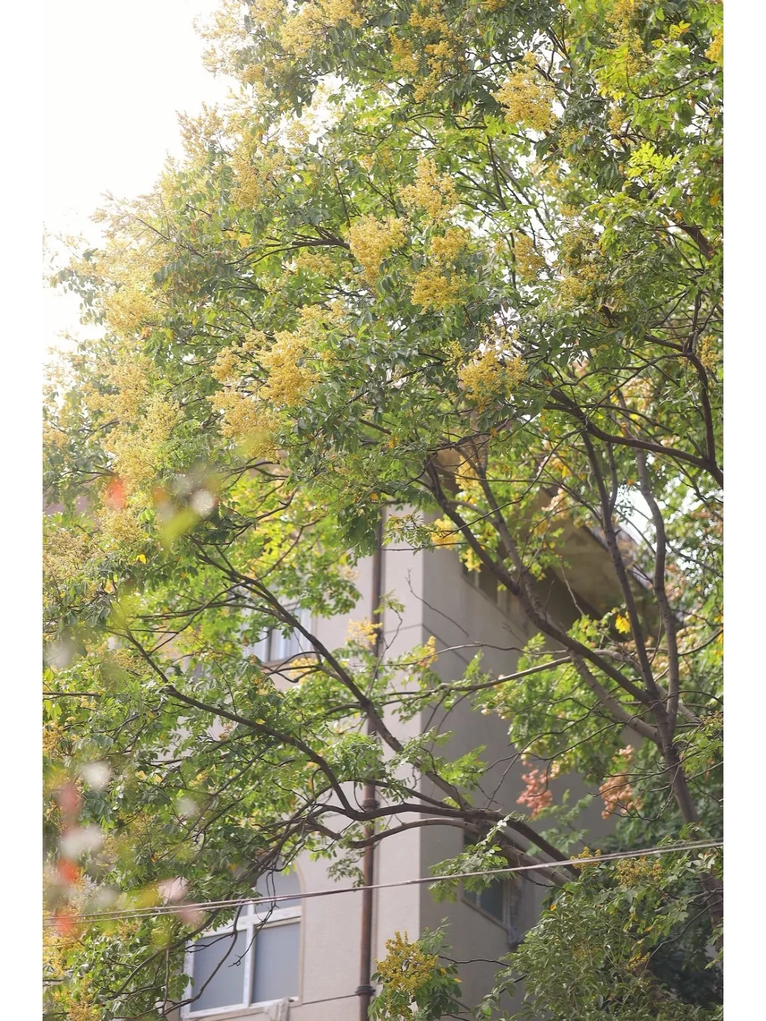 ✔️从阶梯而上,地上落满了栾花,光影与建筑碰撞,美的不像在武汉,好像在首尔
