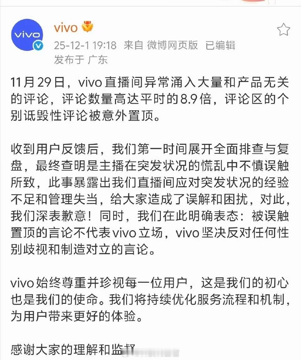 vivo回应直播间遭遇异常网暴vivo声明来了,原因在此大家可以看了,但是某些人趁机黑那就不对了吧?