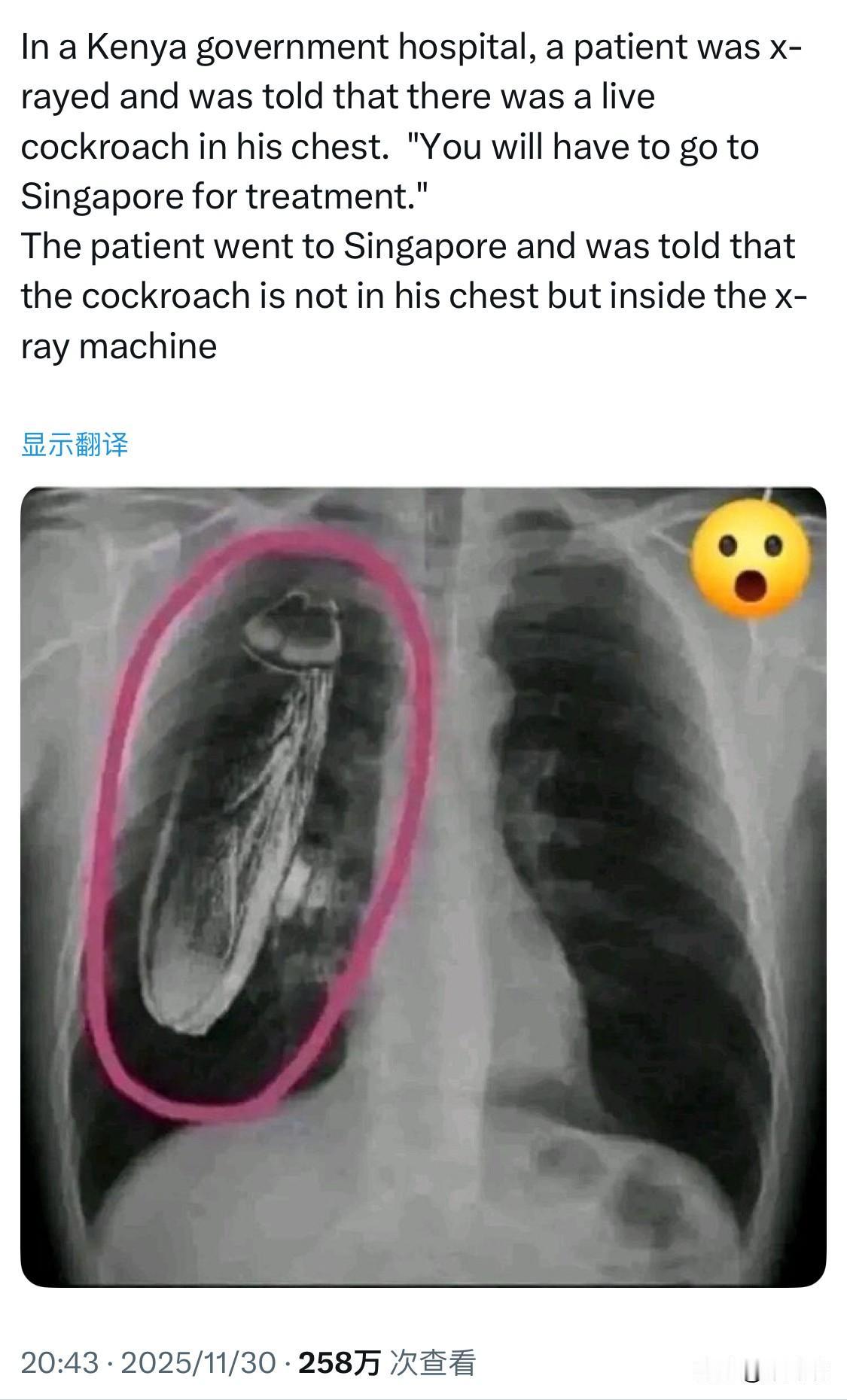 在肯尼亚一家公立医院,一名病人接受X光检查后被告知,他的胸腔里有一只活蟑螂。“你必须去新加坡接受治疗。” 病人去了新加坡,医生告诉他蟑螂不在他的胸腔里,而是在X光机里。