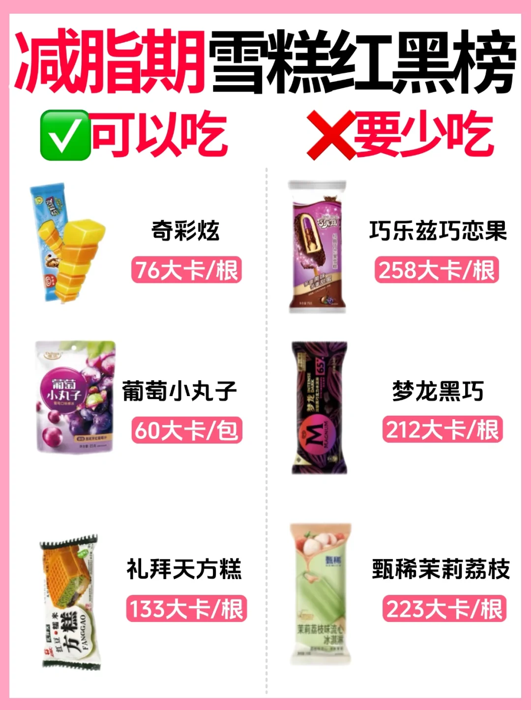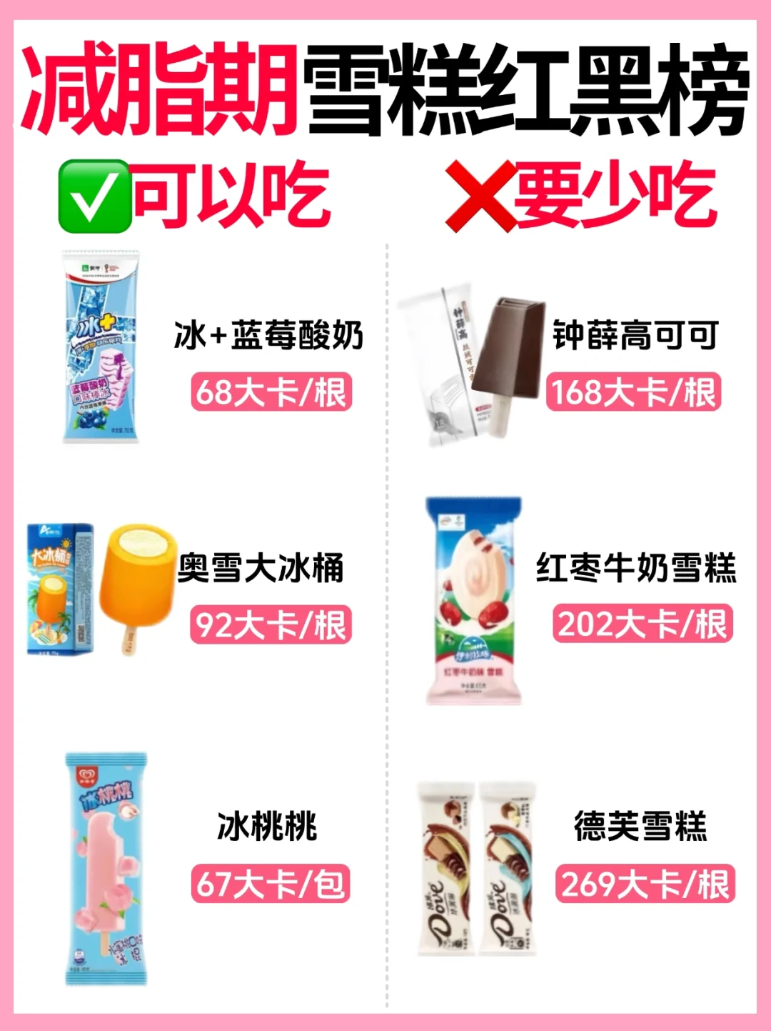[偷笑R]夏天当然少不了冰淇淋啦!给你们整理了一期减脂期雪糕红黑榜🔥可以吃🆚要少吃‼️附热量🔥减脂期夏日必备✅建议收藏✅亲测好吃不胖‼️想吃雪糕的姐妹们快收藏~ ✅可以吃 绿色心情 老冰棍 绿舌头 冰+芒果雪泥 玉米棒雪糕 雪莲 冰+蓝莓酸奶 奥雪大冰桶 冰桃桃 奇彩炫 葡萄小丸子 礼拜天方糕 ❌要少吃 随便香草 随便草莓脆皮 随便脆皮 鲷鱼烧冰淇淋 苦咖啡雪糕 梦龙香草坚果 钟薛高可可 红枣牛奶雪糕 德芙雪糕 巧乐兹巧恋果 梦龙黑巧 甄稀茉莉荔枝 喜欢💕请多多点赞,感谢支持~