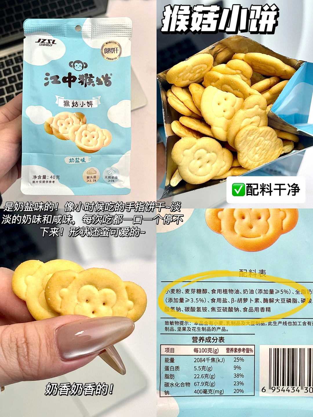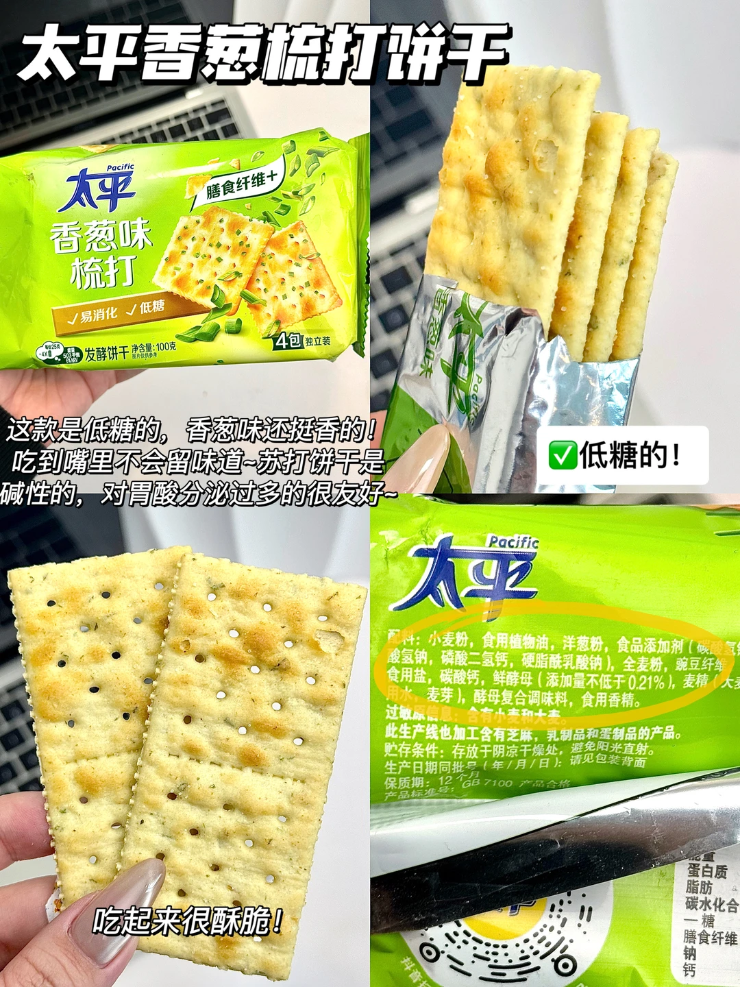 这款是低糖的,香葱味还挺香的!吃完嘴里不会留味道~苏打饼干是碱性的,对胃酸分泌过多的很友好~