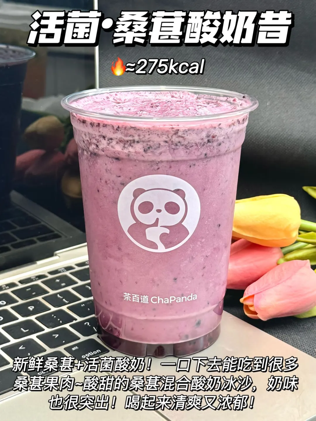 新鲜桑葚+活菌酸奶!一口下去能吃到很多桑葚果肉~酸甜的桑葚混合酸奶冰沙,奶味也很突出!喝起来清爽又浓郁!
