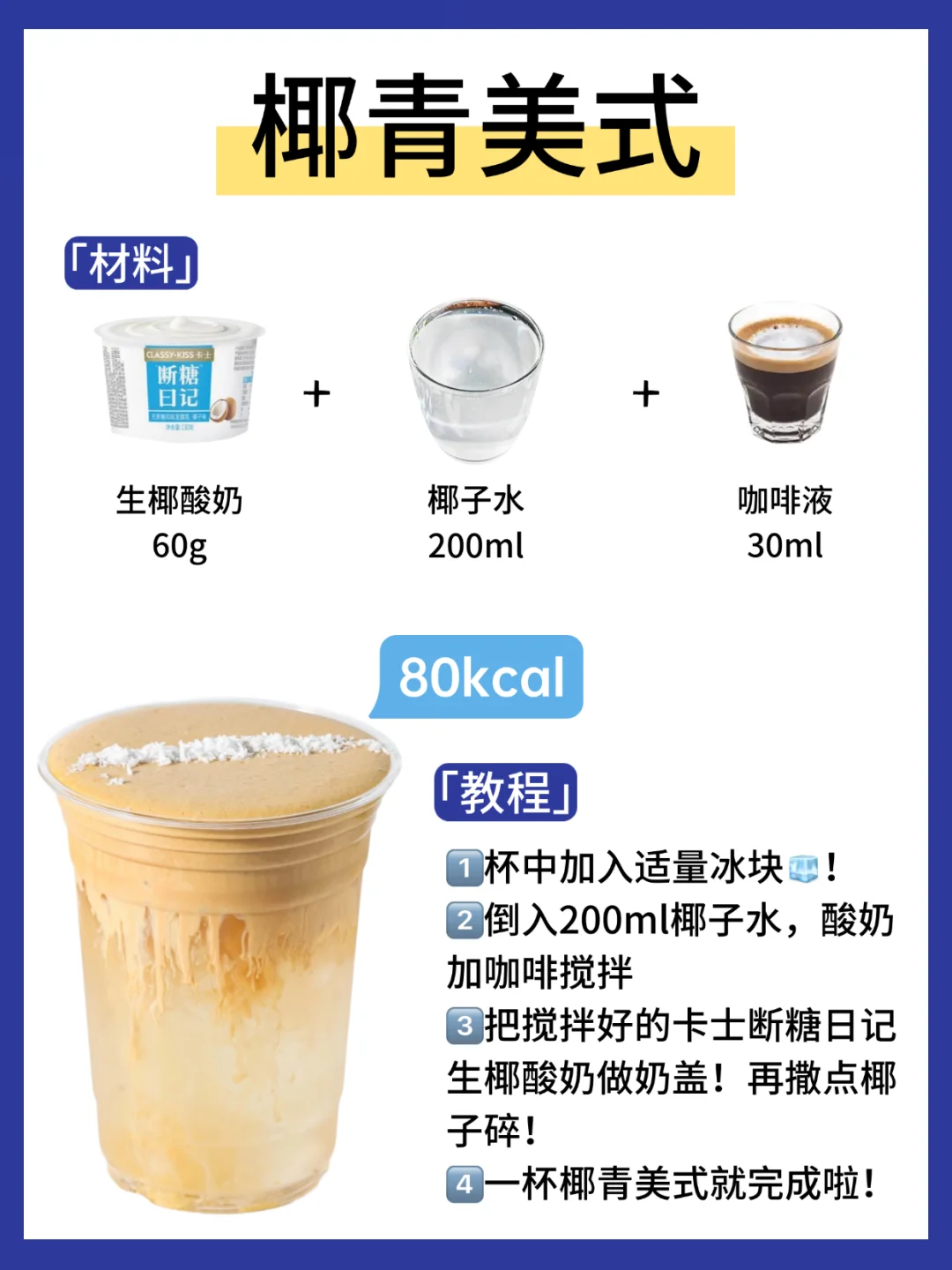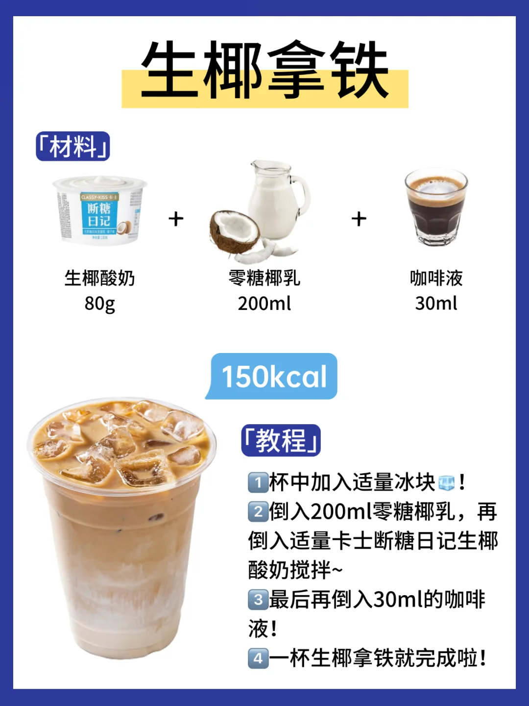 🥥生椰拿铁:咖啡液+无糖椰乳+生椰酸奶
