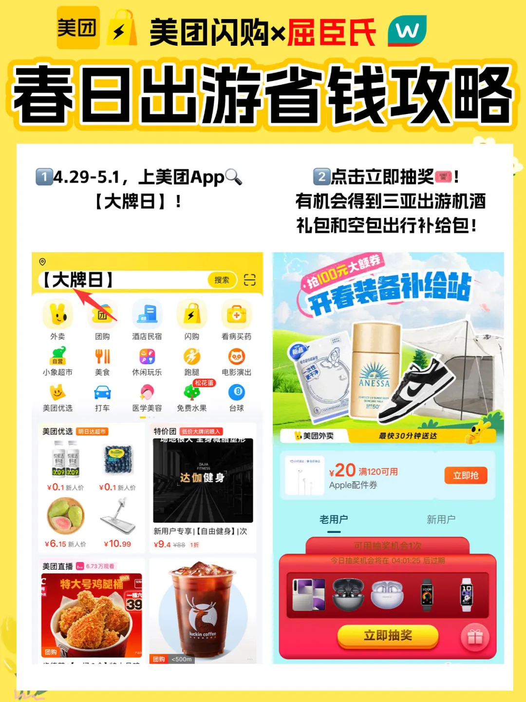 🔥现在新老朋友还有进入活动页面还可以参与抽奖!⏰4.29-5.1,上美团闪购🔍【大牌日】!就有机会得到三亚出游机酒礼包✖️8份和空包出行补给包✖️300份!