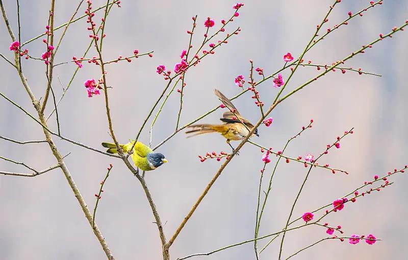上联:冬去山明水秀,下联:请你来春来莺歌燕舞。