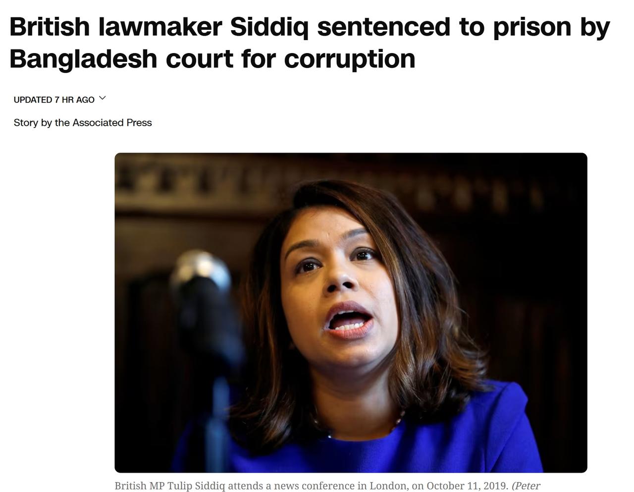 英国议员西迪克因腐败被孟加拉国法院判刑两年 当地时间周一,孟加拉国首都的一家法院判处前总理谢赫·哈西娜五年监禁,她的侄女、英国工党议员图利普·西迪克因涉及政府土地项目的腐败罪被判处两年监禁。 达卡特别法庭法官拉比乌尔·阿拉姆表示,哈西娜滥用总理职权,而西迪克则因贿赂她的姑妈,帮助母亲和两个兄弟姐妹获得政府项目中的土地而被控。西迪克的母亲谢赫·雷哈纳被认为是案件的主要参与者,被判处七年监禁。 法官还对三人分别处以罚款813美元,并下令取消分配给雷哈纳的地块。此案还有另外14名嫌疑人。 检方称,西迪克以孟加拉国公民身份受审,当局获得了她的护照、国民身份证和税号。但西迪克否认这一说法,称她是英国公民,而非孟加拉国公民。 西迪克代表伦敦汉普斯特德和海格特地区的英国议会席位,今年一月,西迪克因与姑妈的关系受到压力,辞去了斯塔默总理内阁政府部长职务。西迪克曾表示自己已被证明无不当行为,但因问题“分散政府工作注意力”,她将辞去财政部经济秘书职务。 孟加拉检察官哈桑表示,他们将通过孟加拉国外交部就西迪克的判决与英国政府联系。 英国执政工党表示,无法承认该判决,因为西迪克无法获得公平的法律程序,也从未被告知对她的指控细节。