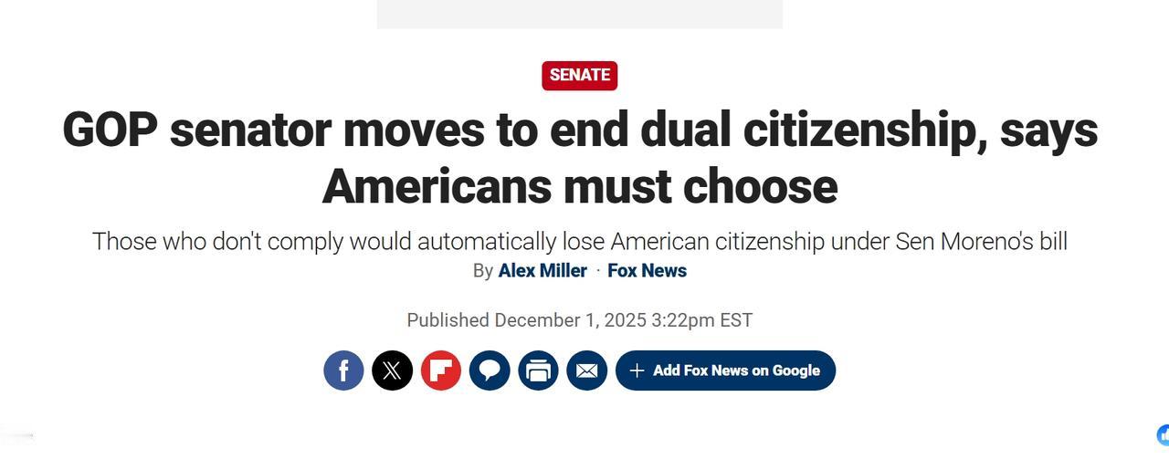 美国参议院共和党人推出法案,结束双重国籍,要求公民必须对美国“专属效忠” 当地时间周一,俄亥俄州共和党参议员伯尼·莫雷诺计划于提出一项立法,要求任何拥有外国国籍的美国公民必须在两国之间做出选择,还要求如果如果未来美国公民申请外国公民身份,该人被视为自动放弃美国国籍。 美国现行法律允许美国人在国内外持有公民身份,并不要求个人必须选择一方。 该立法被称为《2025年专属公民法案》,被宣传为一项旨在增强美国利益的措施,原因是担心持有双重国籍会导致“利益冲突和忠诚分裂”。这将改变移民法,使现有双重国籍者在美国和持有公民身份的国家之间做出选择。 该法案要求国务院和国土安全部(DHS)建立数据库和规则,以追踪和执行公民身份法律的变更。在实施一年后,允许拥有双重国籍的美国人可以选择要求放弃其外国国籍,或通知国土安全部他们打算放弃其美国国籍。如果某人在一年内未遵守变更,将自动被视为已放弃美国国籍。 根据法案文本,对于那些自愿或非自愿放弃美国公民身份的人,国土安全部和司法部长将被要求确保这些人“在联邦系统中被适当登记,并在移民法中被视为外国人”。 尽管特朗普总统已采取措施终结出生公民权,这一政策在法院中被严厉质疑,最高法院迄今未受理,但政府尚未对双重国籍表态。莫雷诺的法案也可能在法庭上面临争议。美国最高法院在20世纪50年代就双重国籍问题作出裁决,并一直维持该裁决。