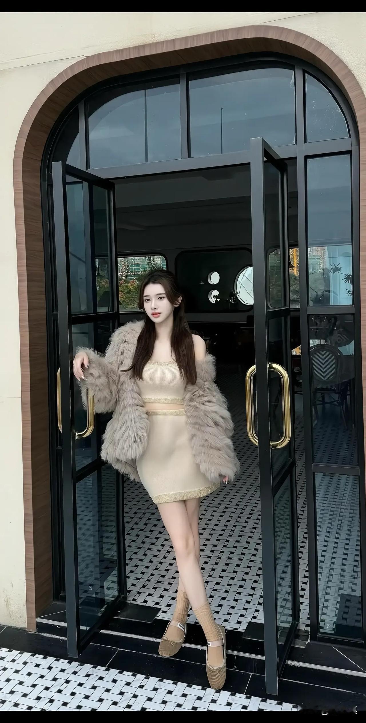 优雅气质,毛绒外套与米色连衣裙的完美搭配,尽显时尚魅力!👗🧥👠